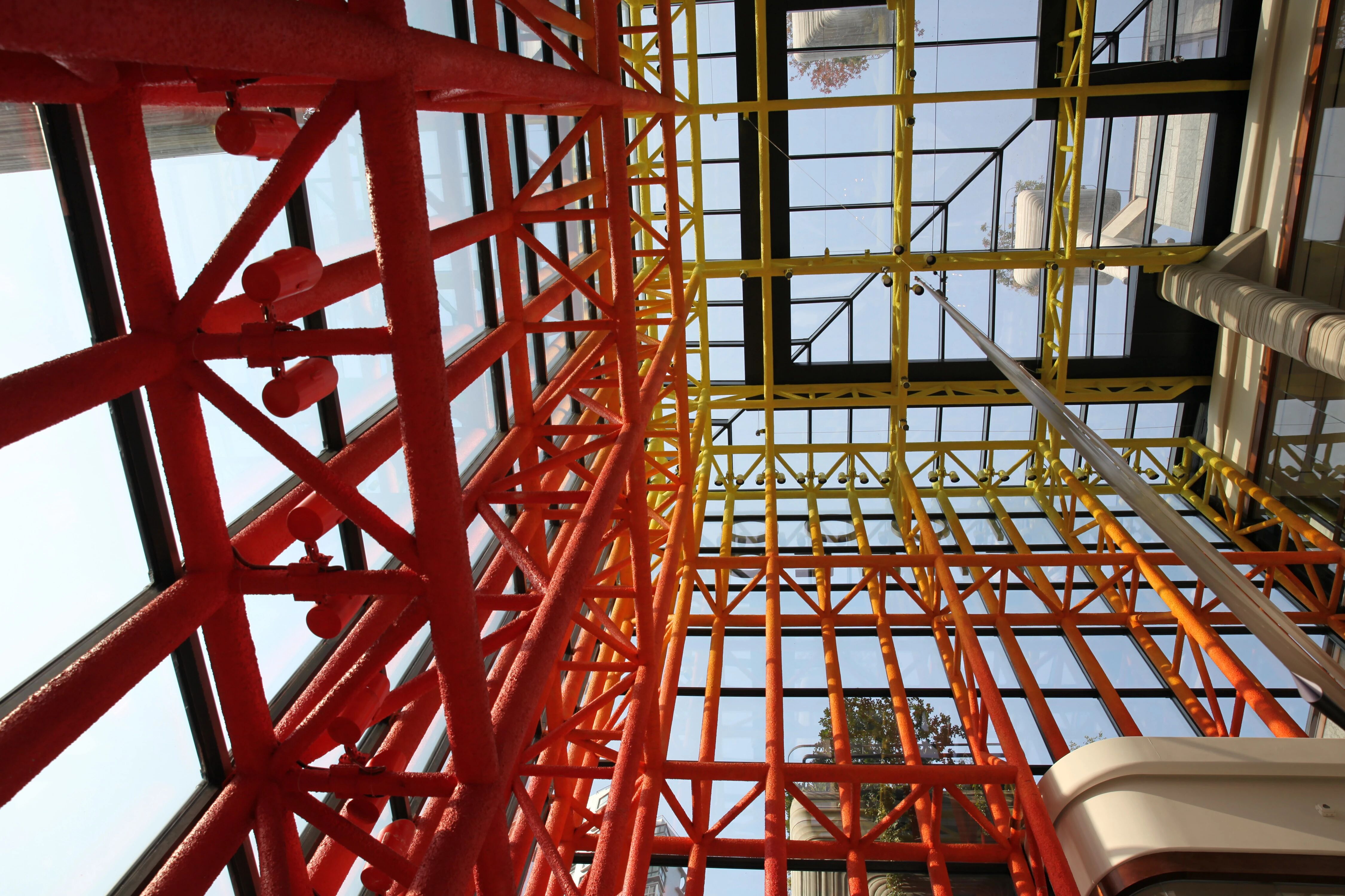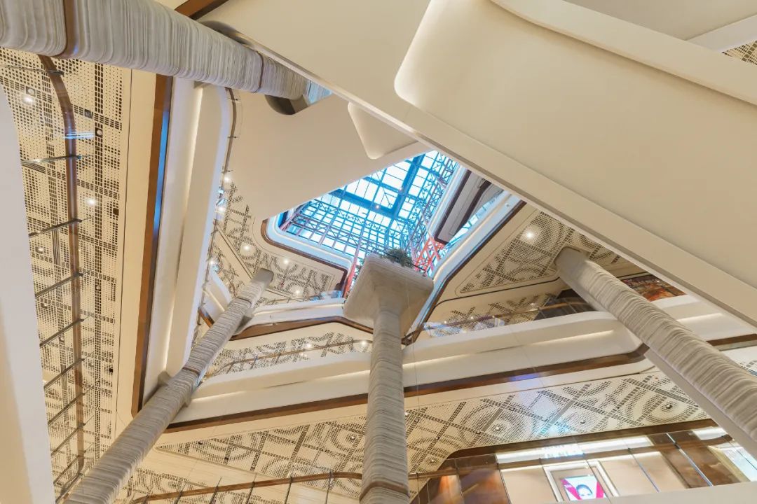 从莫干山路进入商场,左手边就是一个超高透明大厅——日出空间。橙黄两色渐变的钢结构支架与透明的玻璃幕墙交相辉映,仿佛复刻了旭日东升时的绚烂。