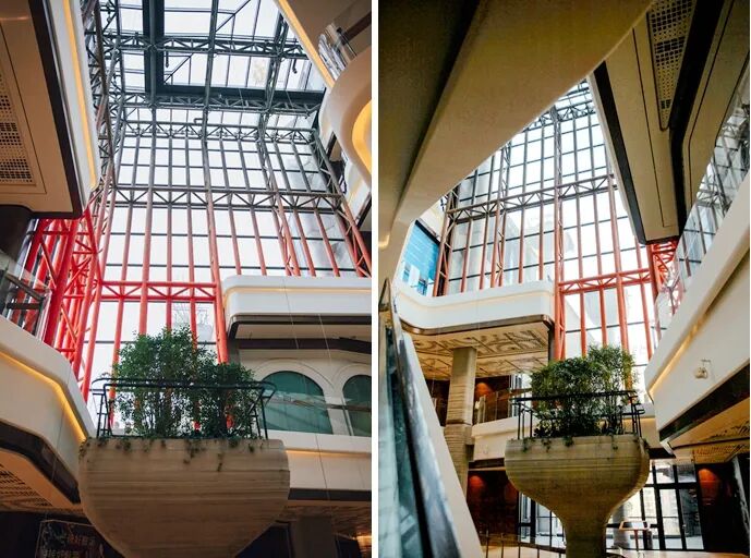 商场内部还有一个日落空间与日出空间相呼应,需要乘电梯上楼才能一睹其风采!橙红色的主色调是日落霞光的颜色,这里还有整个商场内唯一一棵的“空中之树”!