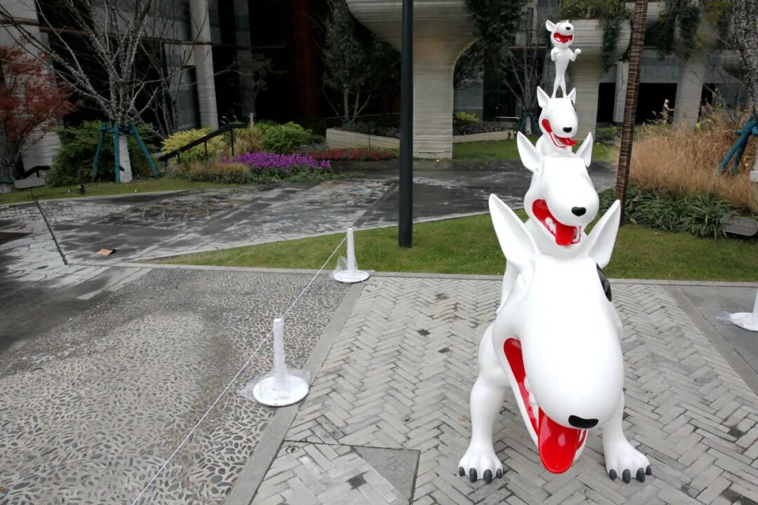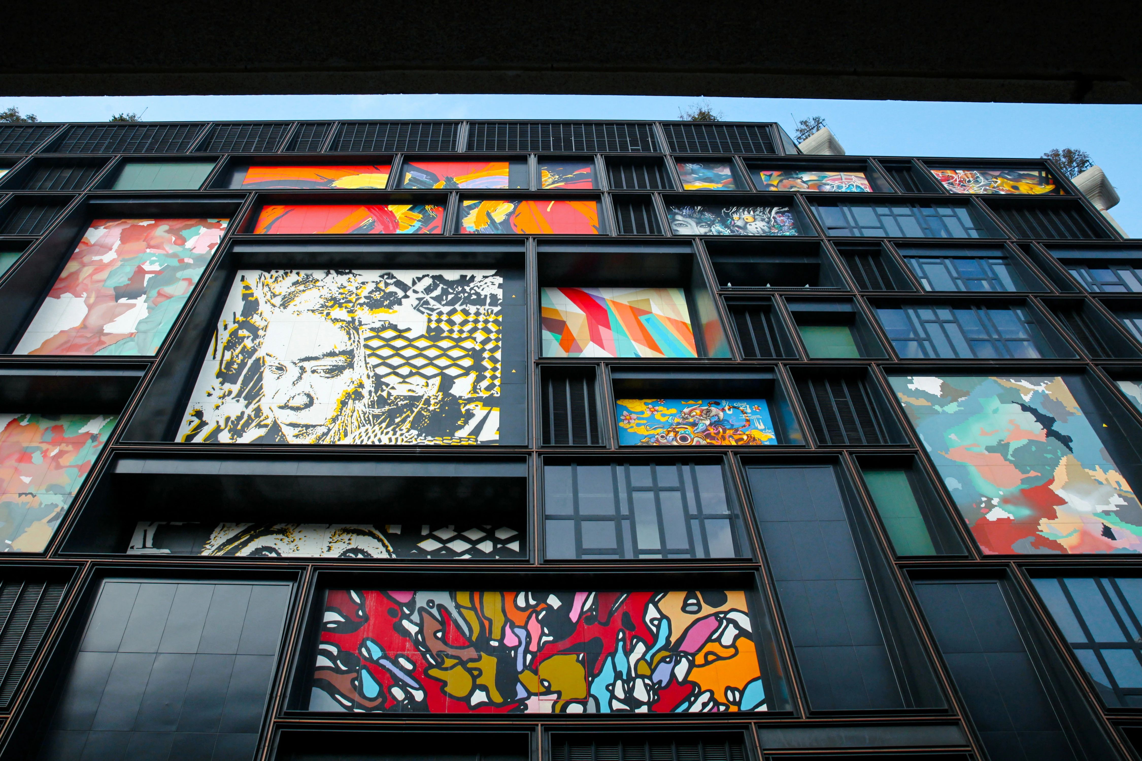 靠近莫干山路一侧,这座“大山”就像是被大斧从中劈开,如悬崖峭壁般陡直。这里是一整面的“艺术巨幕墙”,16幅极具个性的巨型涂鸦是特邀艺术家创作的,以此向莫干山路“涂鸦传统”致敬!