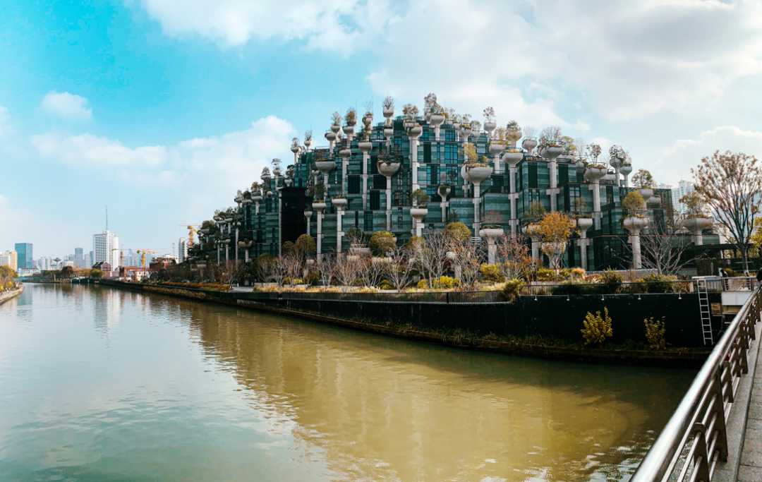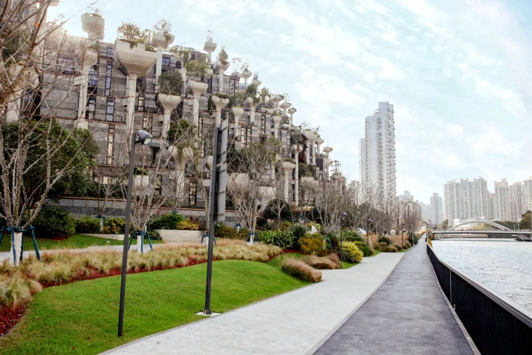 远远站在昌化路桥,你就会看到苏州河边的上百个露台、数百根清水混凝土生命立柱和许许多多植物。绿植与钢筋水泥的融合,模糊了建筑、花园和景观之间的界限。