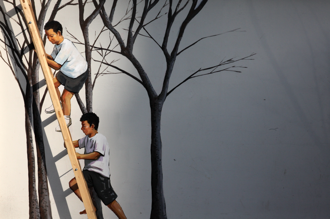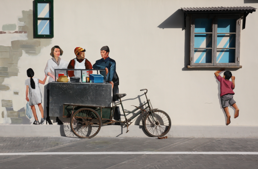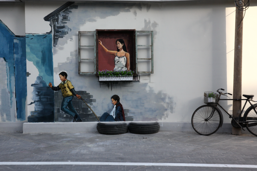在天安·千树一期的停车场外,也有一段约90米长的涂鸦墙, 上面画的是上海人家的生活场景,理发店、包子铺、小超市……仿佛又回到了小时候的弄堂里。