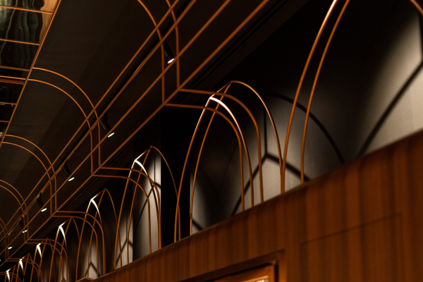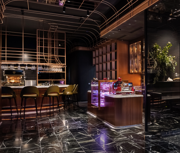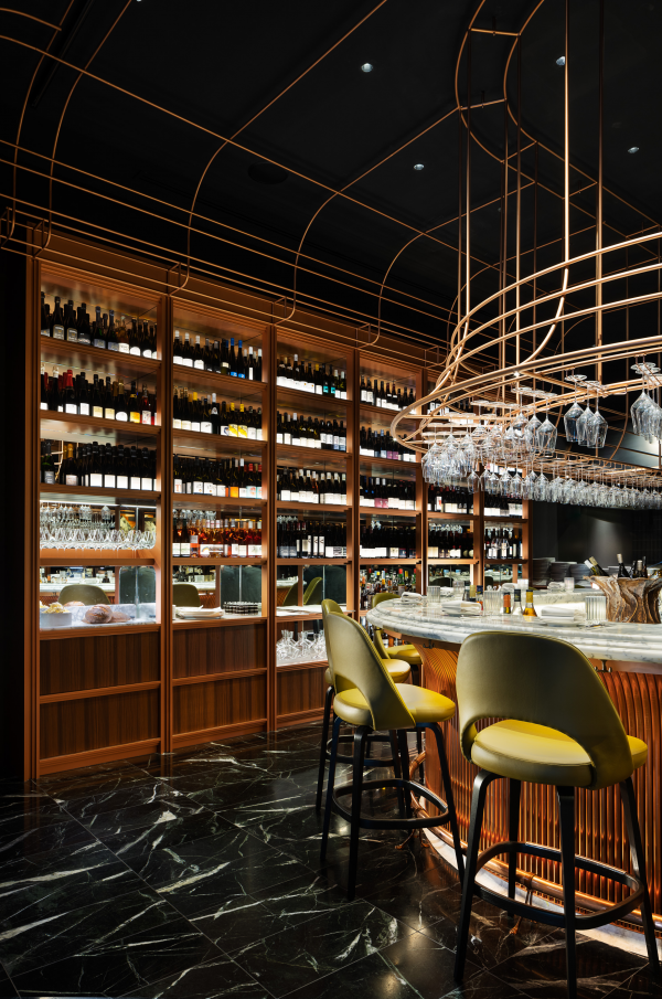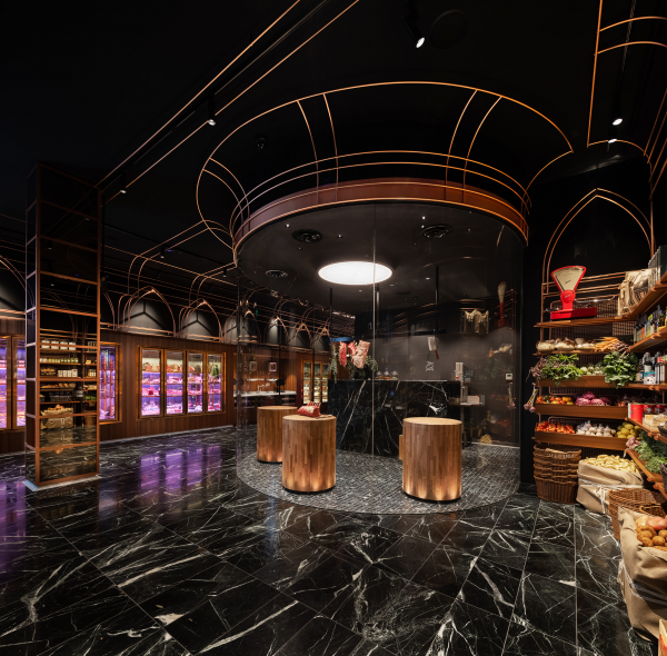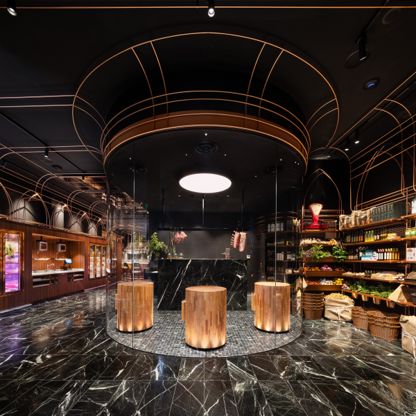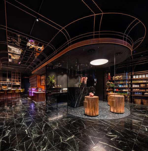 布局是一个以工匠故事,按照顺序讲述,为流体操作编排。一进门,实木砧板就介绍了屠宰的内脏艺术,旁边是铜框架货架上的美食。再往里走,一间喜马拉雅盐砖砌成的腌制室给肉类加工过程带来了柔和的光亮,游客可以在后面的豪华马蹄形酒吧享受他们的购买。镜面墙和天花与反光大理石和玻璃表面相结合,为有限的后部空间带来广阔的错觉。铜、大理石和木材的克制而丰富的材料调色板贯穿始终。头顶的阳极铜拱门参考了克罗地亚教堂的巴洛克式拱门;一种定制的装饰姿态,过渡到吧台上方的功能性酒杯存储。