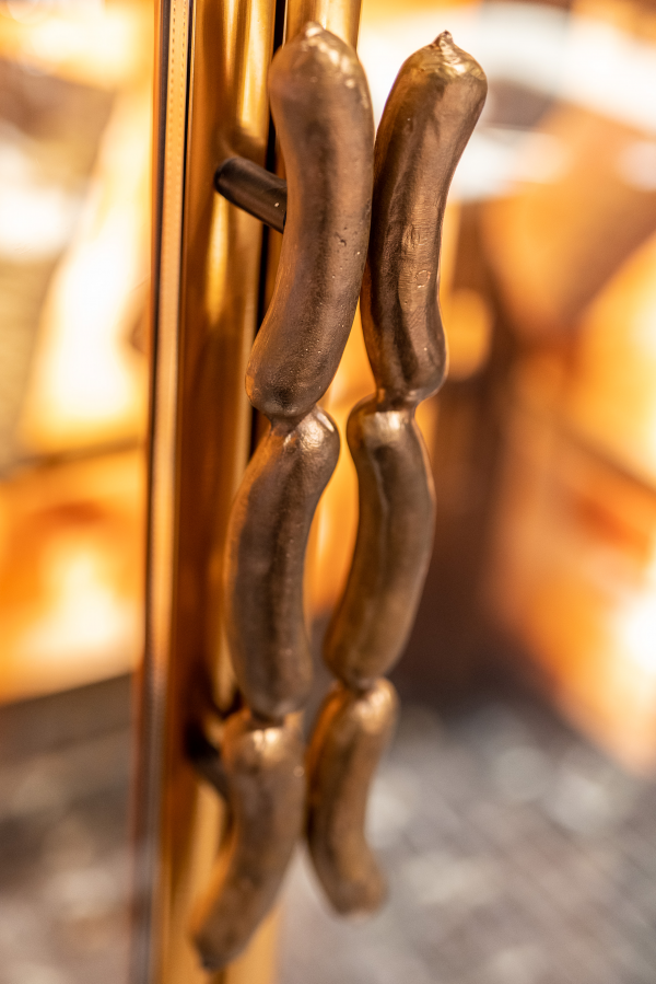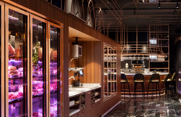 整个过程中,定制的细节提升了内部,从装饰主入口和抽屉的铜香肠门把手,到货架上精致的肉刀切口。一旦穿过镀金的门槛,第一印象是三个实木屠宰场,就像戏剧舞台一样。优雅的、画廊般的冷藏库和陈列柜,昏暗的灯光将粉色扩散到大理石地面上,喜马拉雅盐砖从美学上吸引了人们对固化过程的注意。每一个表面都由丰富的材料和定制的细节定义,为屠宰和美食工艺提供了一个宏伟的舞台。通过这种方式,功能准备支持了设计,促进了客户、工匠和服务器之间的无缝交互。