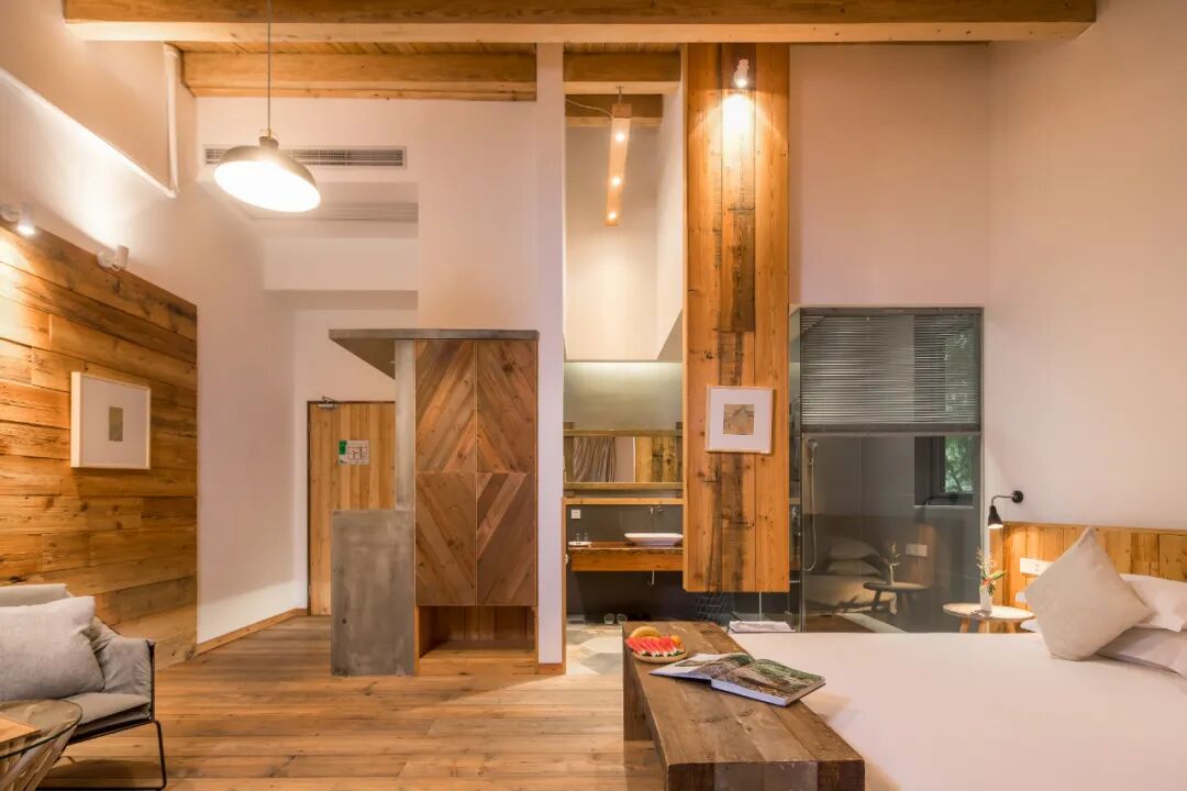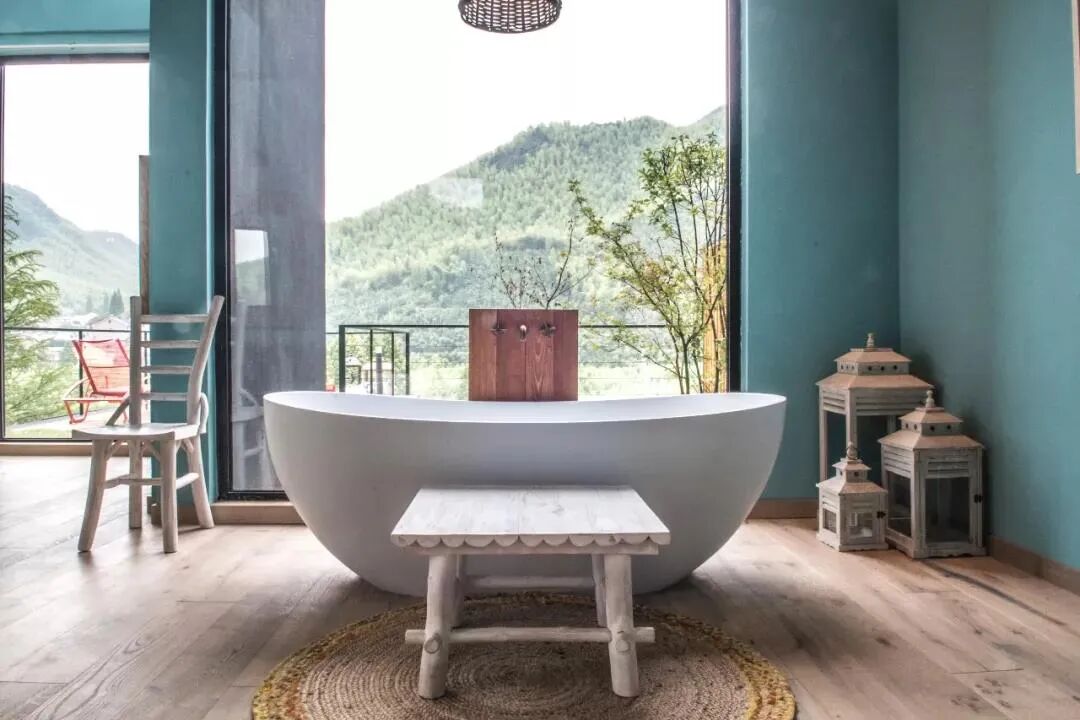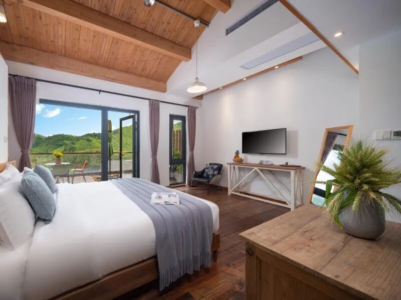 看见远方·听山整体设计简约古朴,回归原生态,尽显与当地自然环境的融合之美。9个房间风格各异,唯一相同的便是只要一拉开窗帘,诗和远方,你都仿佛触手可及。每一扇窗都像是一幅来自大自然的画。墙面厚重而温暖,目之所及皆成风景。每个房间都具备辽阔的视野,一点都不辜负窗外的美景。