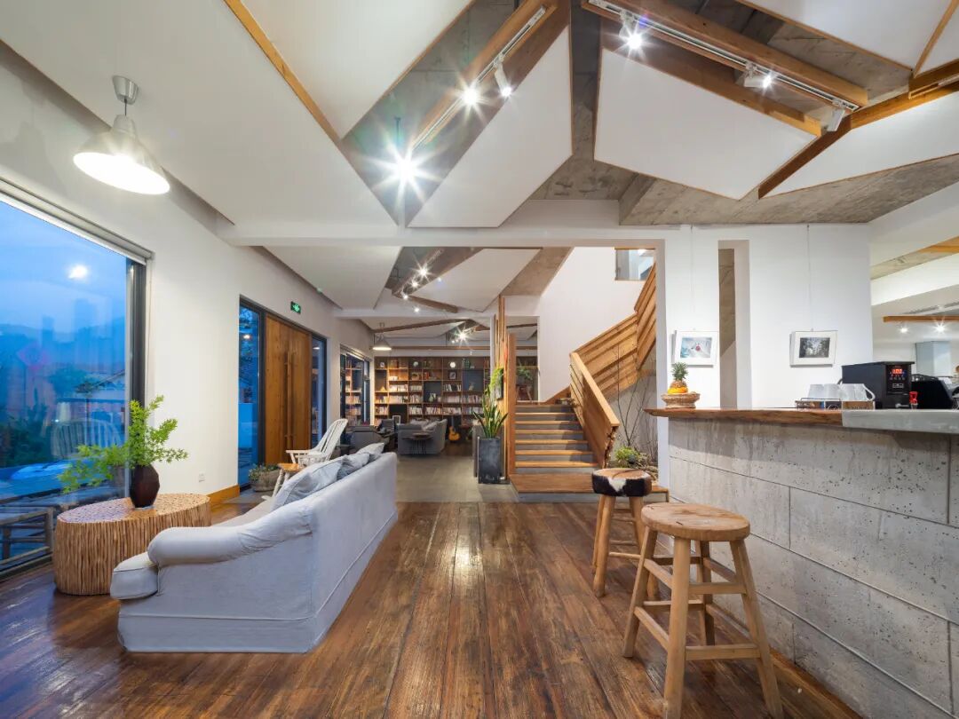 莫上隐像是一位退居山野的智者,不问世事的静坐在这片山林中。一层大厅内别出心裁的设计和细腻的装修心思,处处散发着迷人的魅力,这里包括了吧台、客厅、书吧、茶室、餐厅,是集多种功能为一体的多功能大厅。原来莫上隐的主人,对建筑装修非常热衷,这里的一切都是主人亲手设计,每一个细节都亲力亲为,打造出独一无二的莫上隐。这里应用了大量的原木,和周围的自然环境融为一体,屋顶使用不规则的几何形状划分,这种不规则的美真的让人眼前一亮,一点一滴都饱含着主人的智慧和才华。