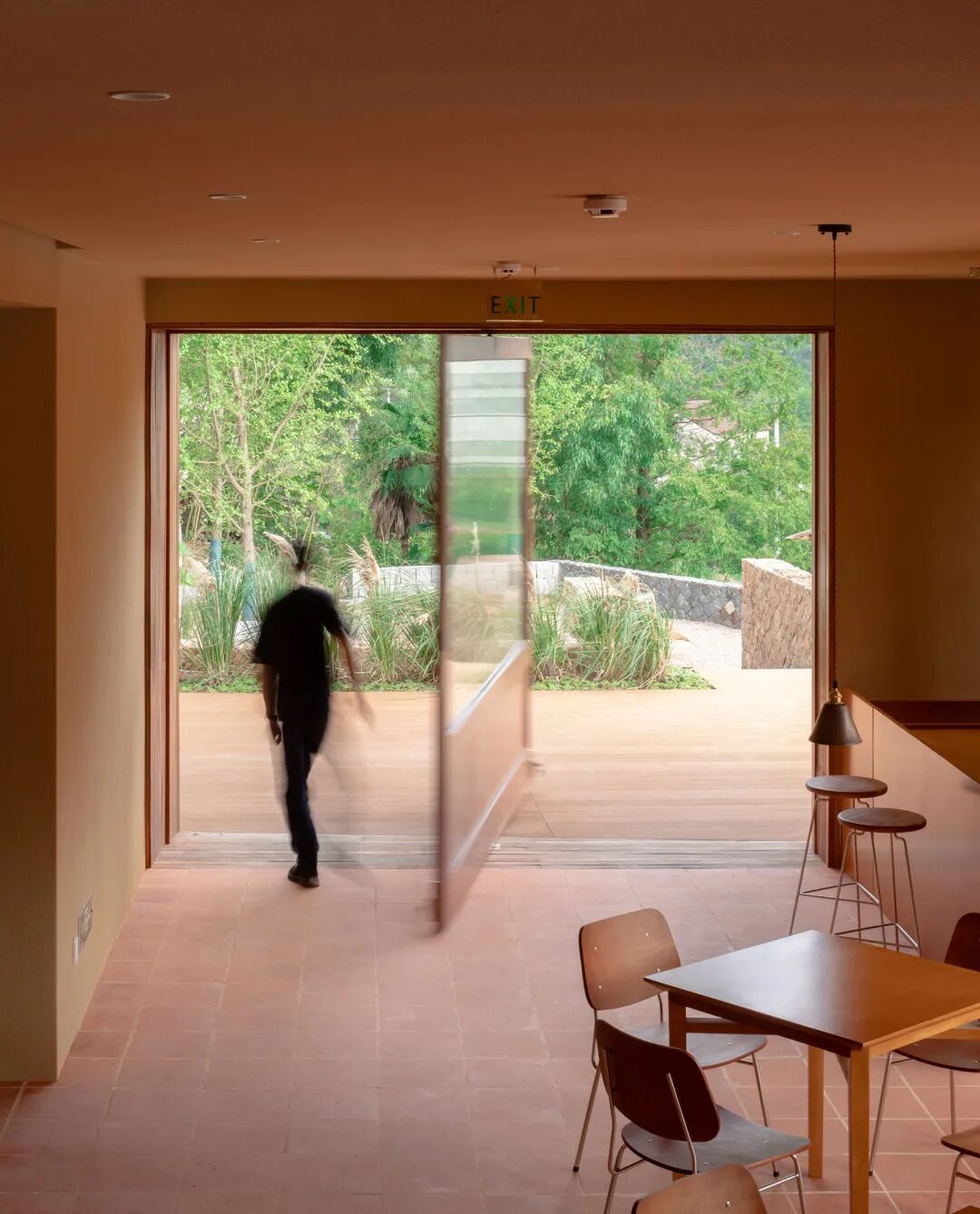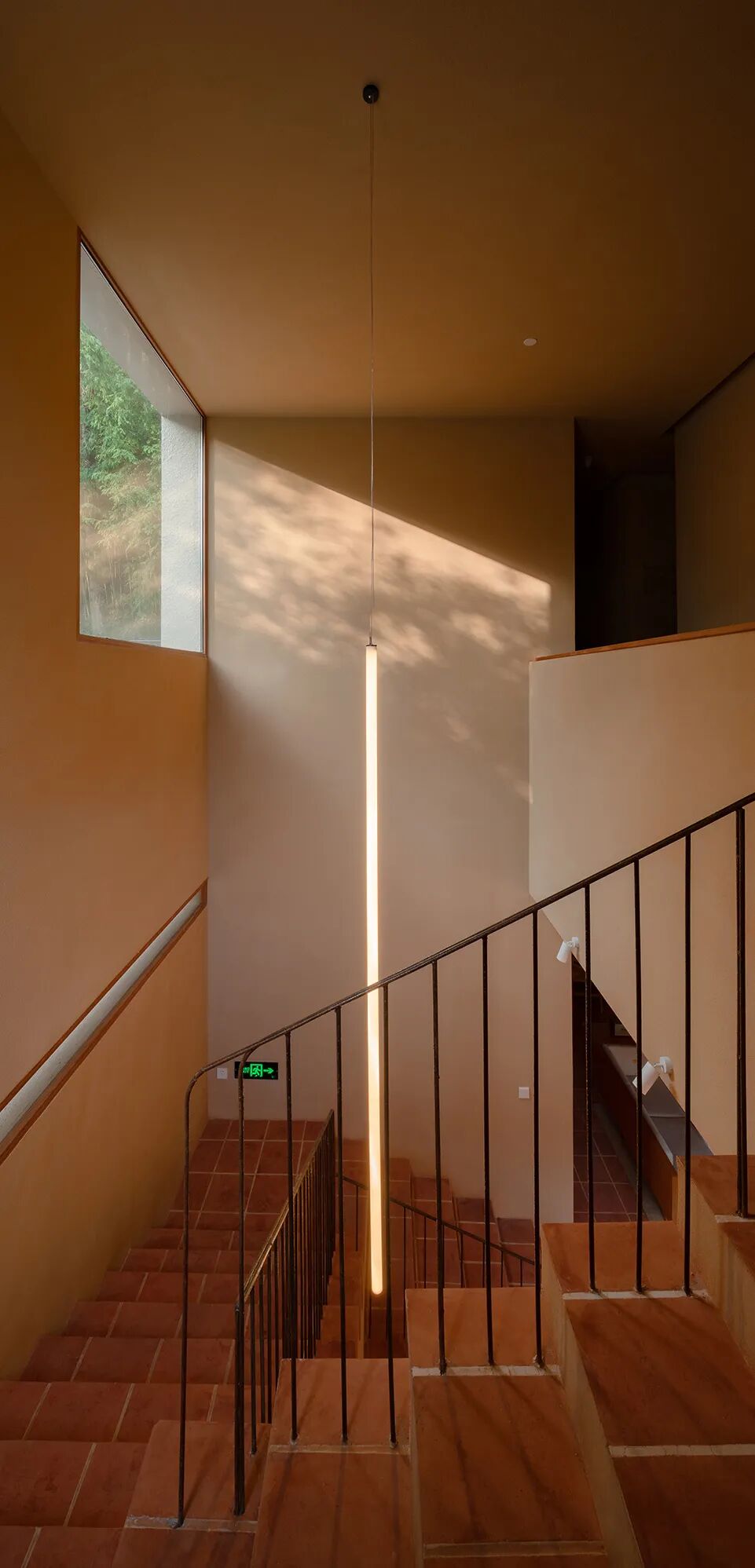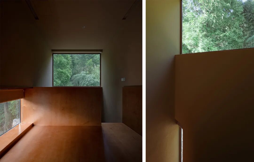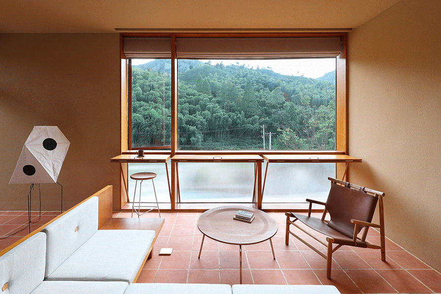 场地四周拥有丰富多样的景色和植物,因此我们希望将其进行重新梳理,从多个角度觅寻周围的水杉、茶田、竹林和远处的山峦,形成了视觉对景。同时通过建筑内部的路径动线设计,有节奏地将每个景色排列到每个窗景上,如同一幅展开的山水长卷。
