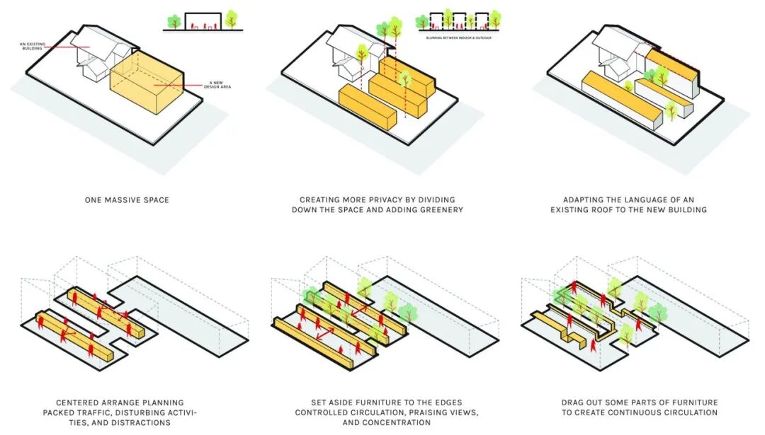 前面的主要建筑是设计为保持现有建筑屋顶线的连续性的结果,建筑延伸成三个体块,其中设有快速吧台区和室内座位区。绿色的景观区域渗透到这些块体之间的缝隙中,并通过天花板上反光的玻璃马赛克映入室内。