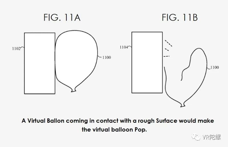 在一些智能手套之外的实施方案中,如在专利图11A和11B中看到的那样,操作可以包括在AR或VR环境中动画化虚拟物体和目标之间的交互。可以响应于目标的表面质量来执行动画。例如,在AR或VR环境中,该环境在显示器上描绘了一个虚拟气球,如果气球几乎与目标接触,并且目标的表面质量足够粗糙,通常会导致气球爆裂,则AR或VR环境可以对气球的 "爆裂"进行动画处理。