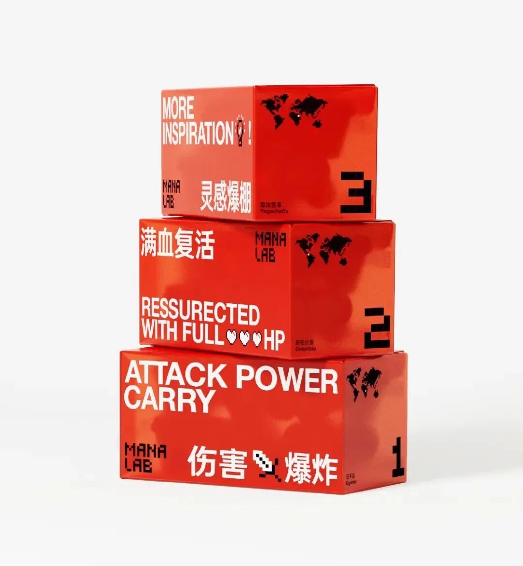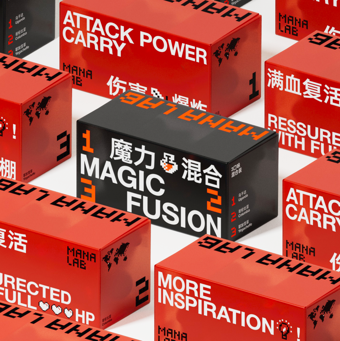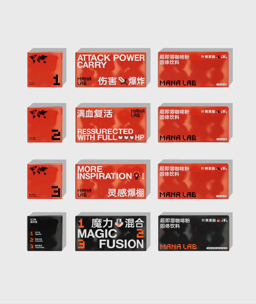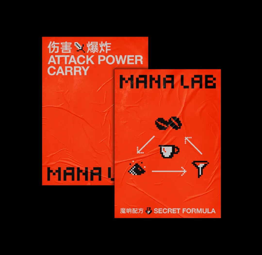 MANA LAB咖啡 魔幻能量,随时唤醒 MANA LAB是于2021年成立的便捷咖啡品牌,基于电商渠道运营,旗下有超即溶咖啡粉、咖啡液等系列产品。作为新锐品牌,MANA LAB品牌名可以解读为魔力实验室,因此,我们在设计之初就希望紧扣「魔力」带来的场景化想象,创作一个风格极致,易于被描述的视觉体系,为品牌后期高ROI做出有力支撑,在消费者购买时有吸引力,复购时能说出诸如“马赛克的那家”此类的描述性用语。 复古马赛克 中二魔力,快乐必备 魔力值、魔法能量等词汇让我们自然想到千禧年前后风靡的单机游戏,我们借用了游戏中的马赛克色块,创作了属于MANA的灵感值、血量、魔法值等元素,展现了咖啡从采集到制作的流程,赋予品牌活泼乐观的性格属性,同时为学习、工作等费神的场景注入鼓励式的答案。