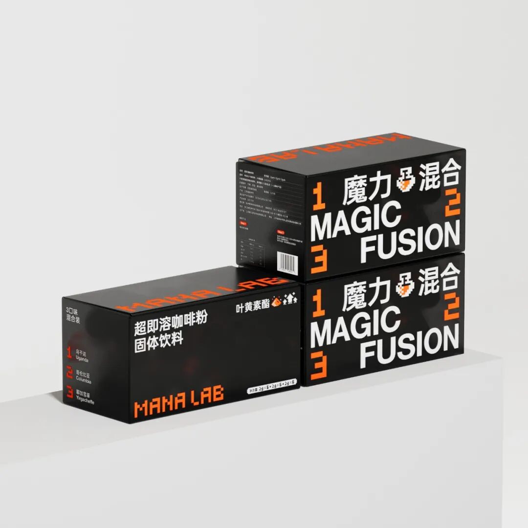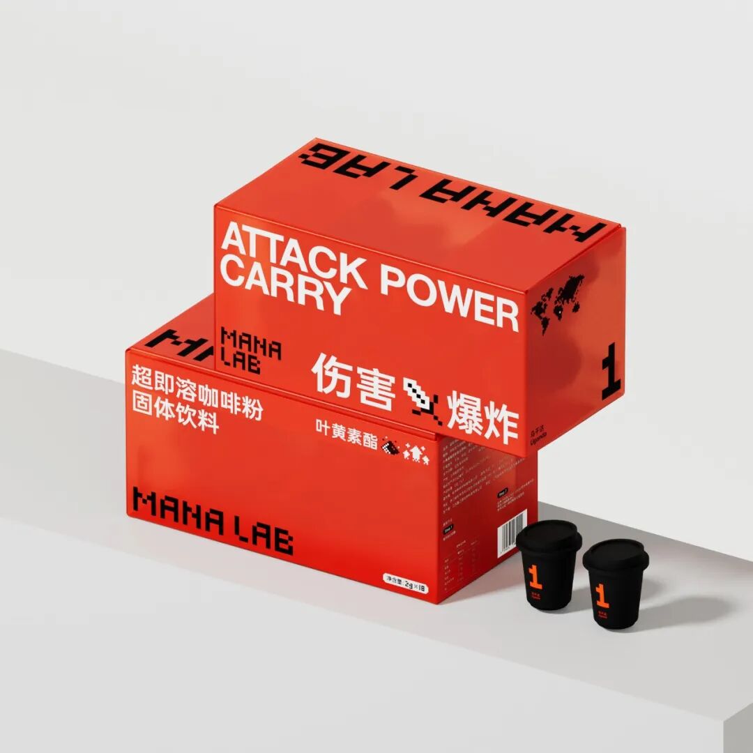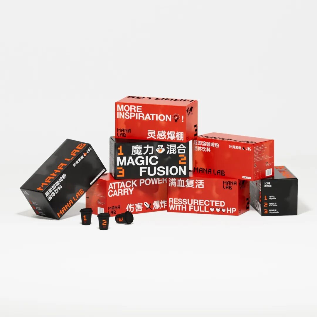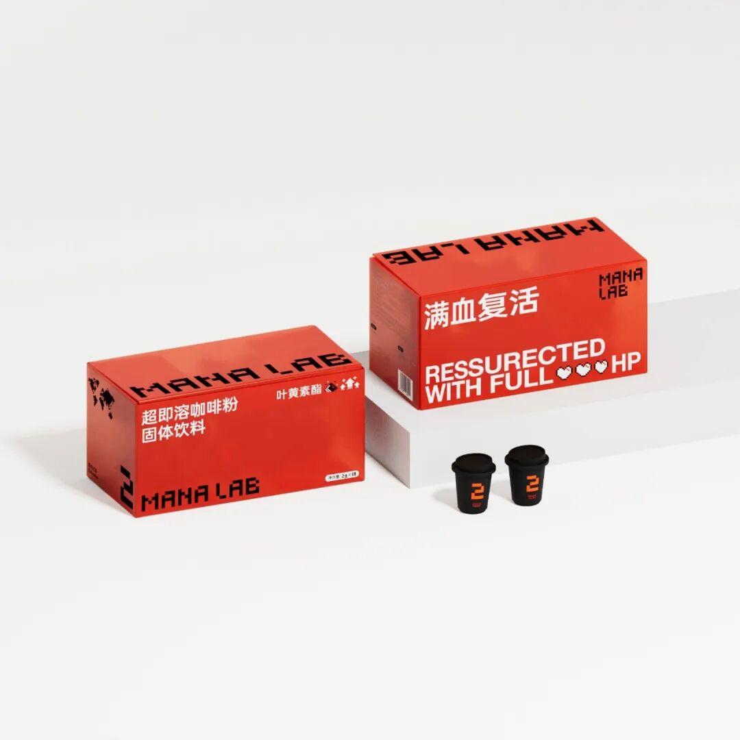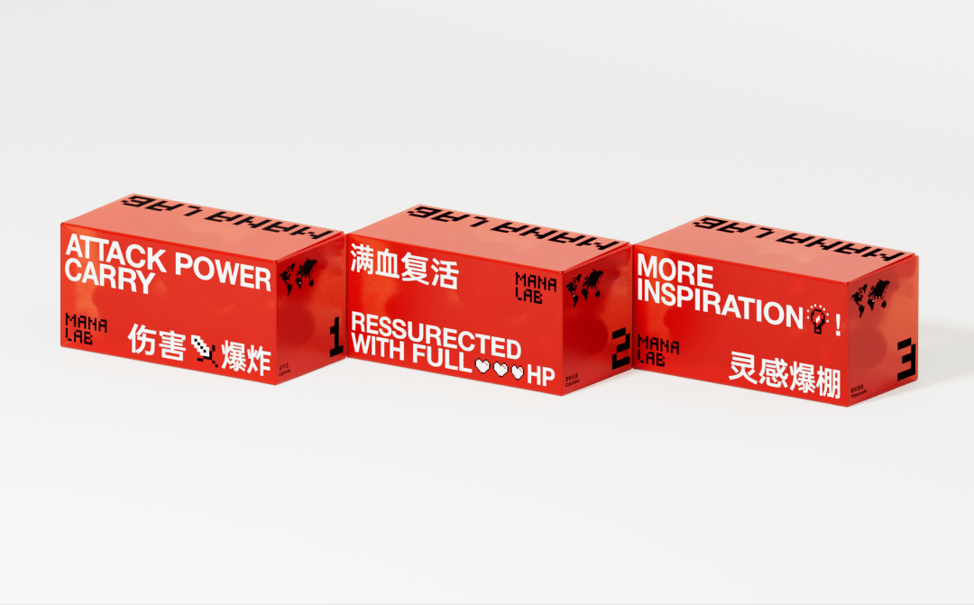 MANA LAB咖啡 魔幻能量,随时唤醒 MANA LAB是于2021年成立的便捷咖啡品牌,基于电商渠道运营,旗下有超即溶咖啡粉、咖啡液等系列产品。作为新锐品牌,MANA LAB品牌名可以解读为魔力实验室,因此,我们在设计之初就希望紧扣「魔力」带来的场景化想象,创作一个风格极致,易于被描述的视觉体系,为品牌后期高ROI做出有力支撑,在消费者购买时有吸引力,复购时能说出诸如“马赛克的那家”此类的描述性用语。 复古马赛克 中二魔力,快乐必备 魔力值、魔法能量等词汇让我们自然想到千禧年前后风靡的单机游戏,我们借用了游戏中的马赛克色块,创作了属于MANA的灵感值、血量、魔法值等元素,展现了咖啡从采集到制作的流程,赋予品牌活泼乐观的性格属性,同时为学习、工作等费神的场景注入鼓励式的答案。