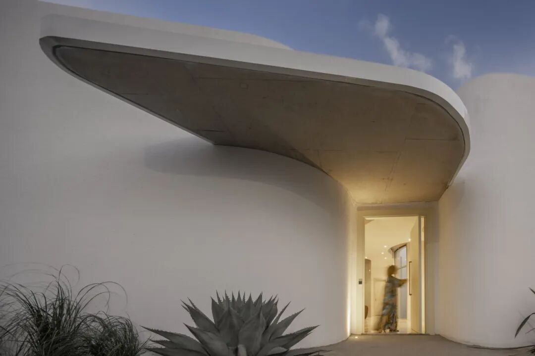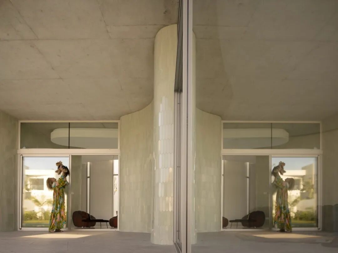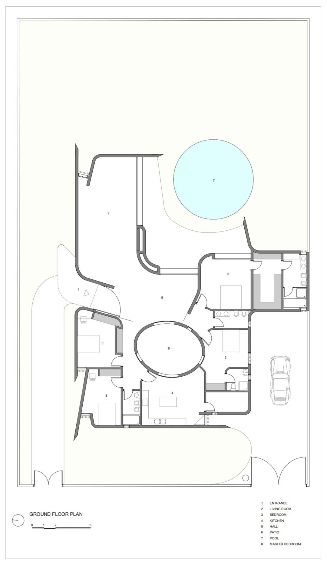 客厅、餐厅和主卧室环绕着圆形游泳池。它给人一种第二个庭院的错觉,在那里绘制了房子的倒影。