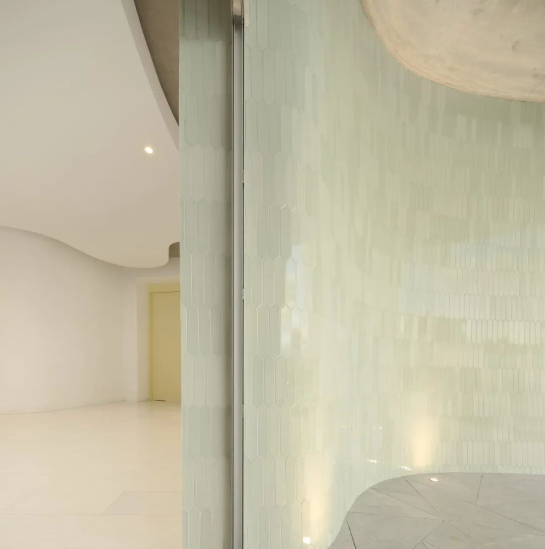 在墙壁的白色和混凝土板的灰色之间,两堵墙被浅绿色瓷砖覆盖,营造出水与天之间的诗意联系。