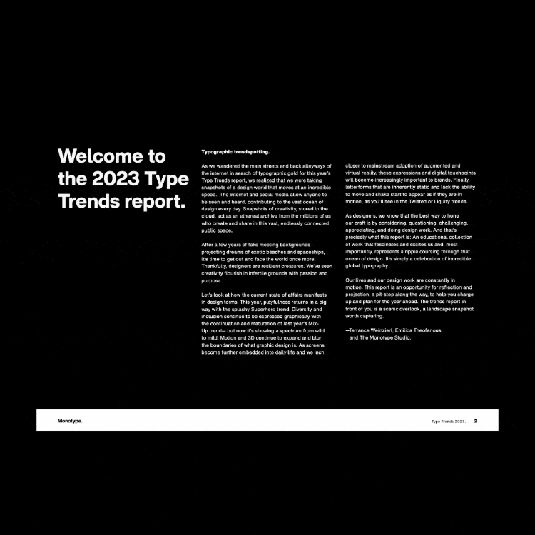 如今,任何动态的物件都会吸引眼球,动画和可变字体更是如此。正如去年报告所述,如今,任何动态事物都会吸引眼球。包括图标在内的可变字体都可以有动态效果,实现起来也更加容易。我们越来越不依赖纸张,转而将内容显示在电子设备上,后者也让文字的动态效果更加普及。