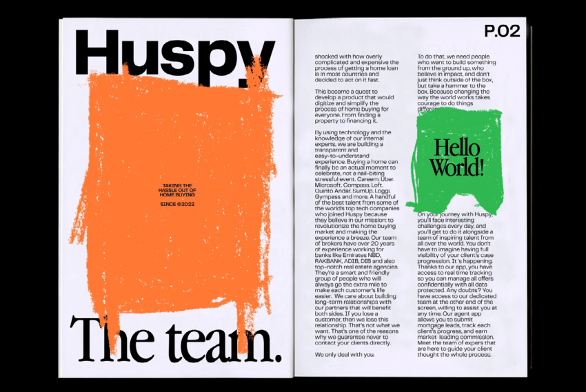 液化:手绘质感 为了追求真实与创新,数字化设计模拟传统艺术工具(如颜料和记号笔)进行人工修整。这保留了印刷品的形式感,以及手工作品的质感和瑕疵感。巴塞罗那的 Codea Studio 就为 Huspy 采用了这种创新方法。Huspy 是一个在线平台,为购房过程提供更人性化的服务。在为品牌创作的视频中,工作室在简单文字设计的基础上添加了草图与涂鸦,让作品拥有更加丰富的层次。