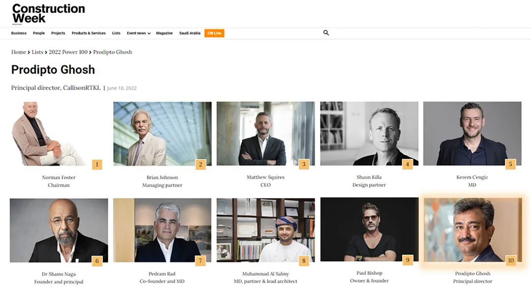 Prodipto Ghosh被《Construction Week Middle East》杂志评为第13届年度“Power 100”榜单十佳建筑设计师