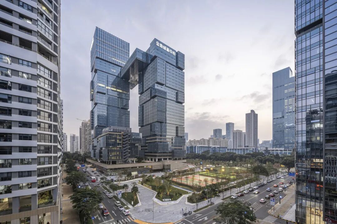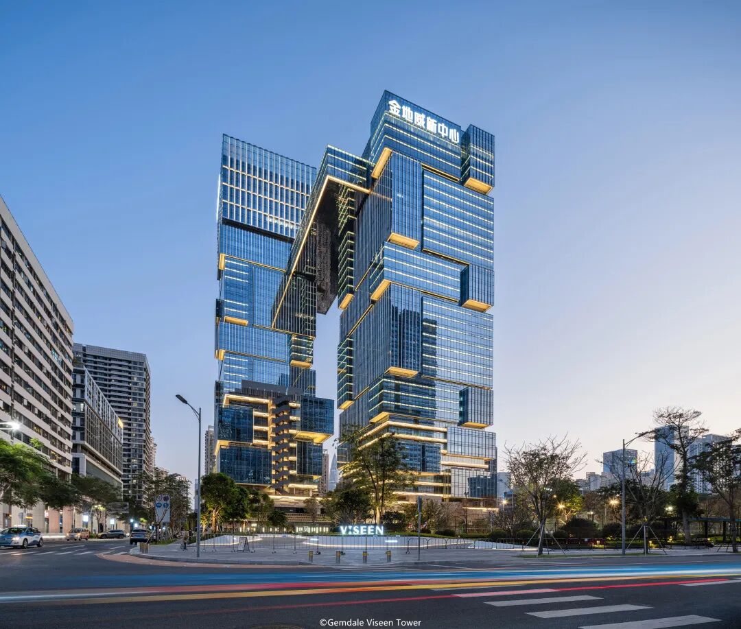 深圳金地威新中心位于中国南硅谷高科技企业总部深圳科技园,位于南山高新区东南角。为向建筑大师贝聿铭的一期和二期设计致敬,三期的设计延续了最初的设计理念,打造了一个“绿色、健康和高科技”的科技园。金地威新中心由两座超高层5A级写字楼、裙楼、智能办公空间和可持续生态系统组成。切合绿色办公、智慧办公和地标办公的未来趋势,该项目采用“芯立方”和“盒体”设计理念,打造出卓越的社交和商务空间。
