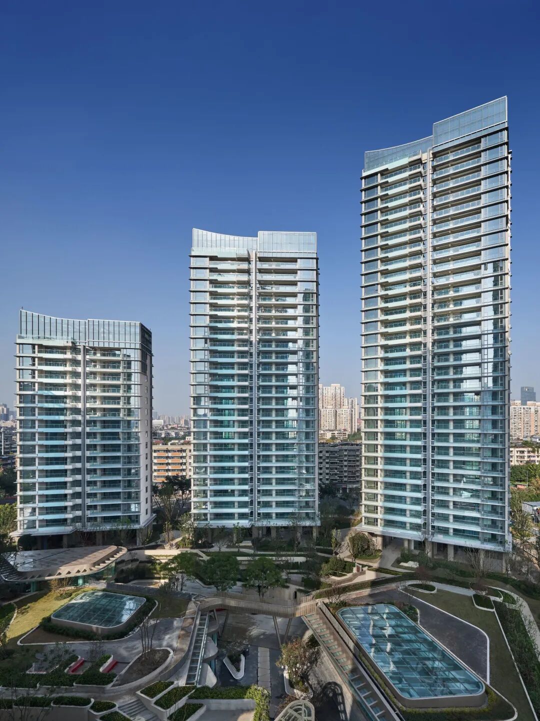 由CRTKL与珠海华发建筑设计公司联合设计的“华发统建 · 锦江首府”,其设计理念取缔于四川盆地概念,由6座住宅塔楼以环抱形式的组团布局生成了中央下沉庭院。塔楼的朝向在满足南北向日照需求的条件下将视野最大化,中央庭院结合地下配套设施,通过梯田形式营造出当代建筑盆地空间。小区外围自然形成独立落客区,赋予5星级酒店的尊贵入户体验。单位设计以极致化的大阳台,通过室内外空间融入了成都休闲生活方式。塔楼立面通过横向设计线条的巧妙比例处理,简洁大气,且将户内对外视线的阻挡减到最低。同时创造出独特的城市形象。