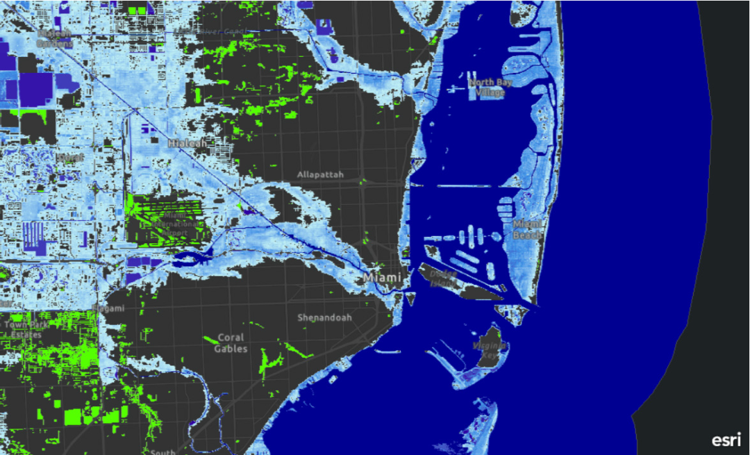 美国人口调查局的数据显示,戴德郡有近100万人在遭遇飓风等巨大气象灾害时面临无家可归的处境,约占当地总人口的37%。浅蓝色代表迈阿密戴德郡发生水位高达6英尺的洪涝灾害。(数据来源:ESRI ArcGIS——美国国家海洋和大气管理局)