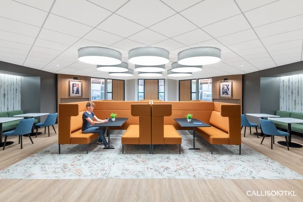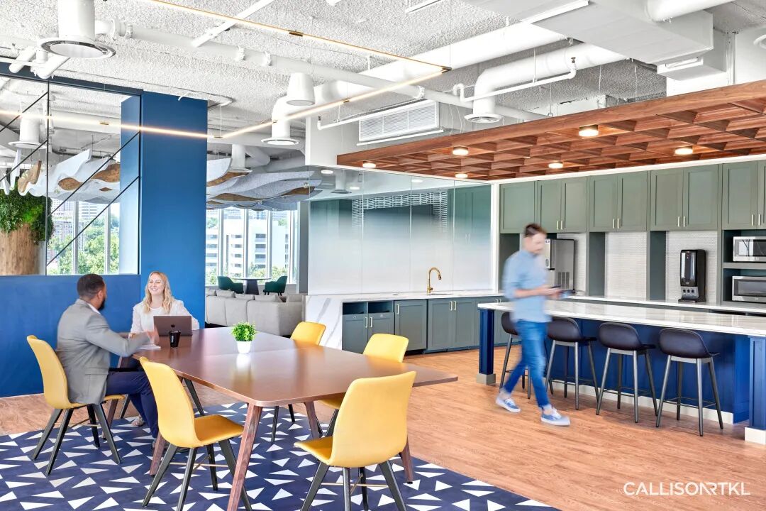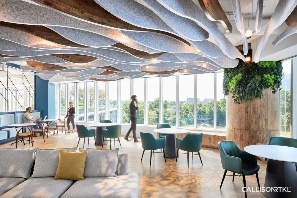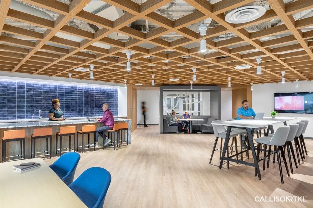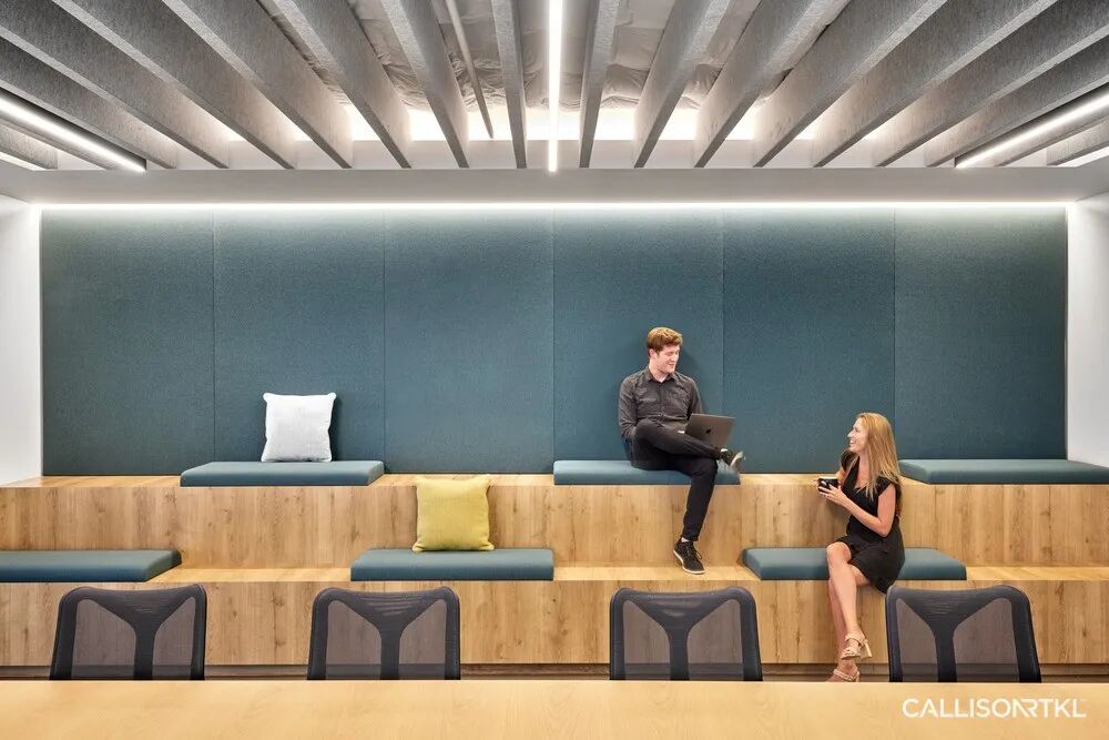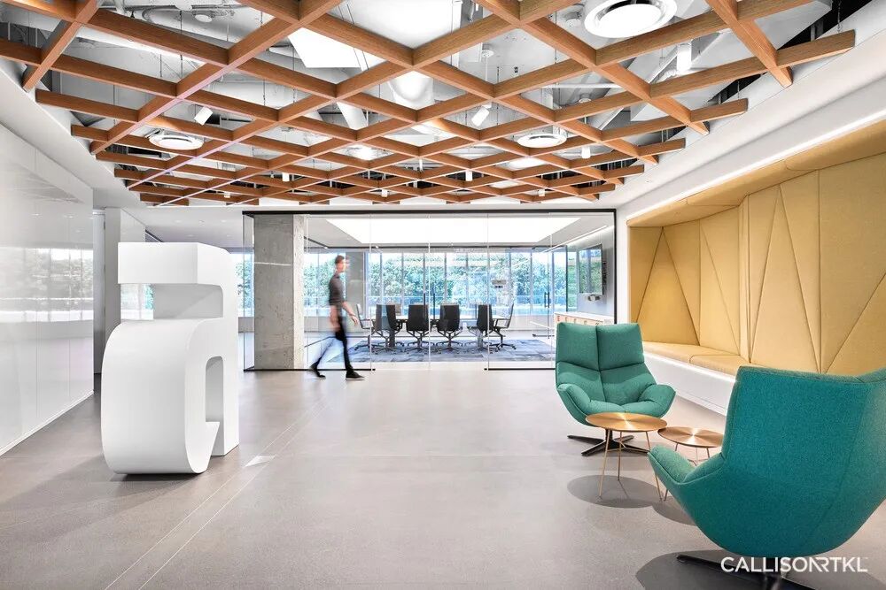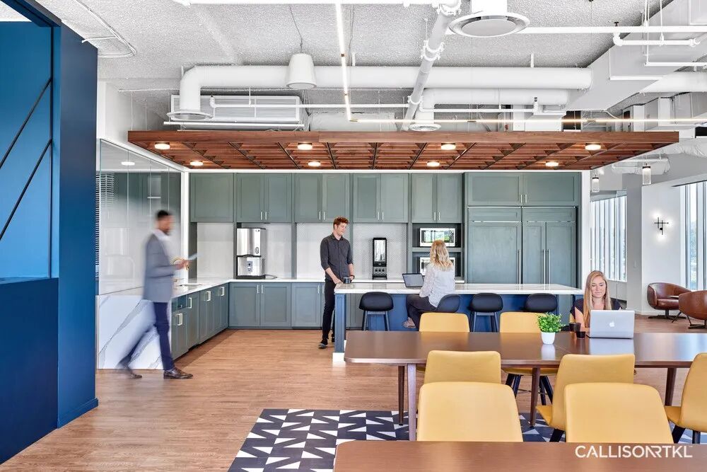 CRTKL在ECP创始办公室的改造设计项目中,分别在三层楼设有全新的公共空间,营造出一种社区感,使员工能够在大型“办公咖啡厅”中举行非正式聚会和公司活动。定制的天花板采用隔音材料制成,可有效降低咖啡厅的噪音,供多个团队同时使用。