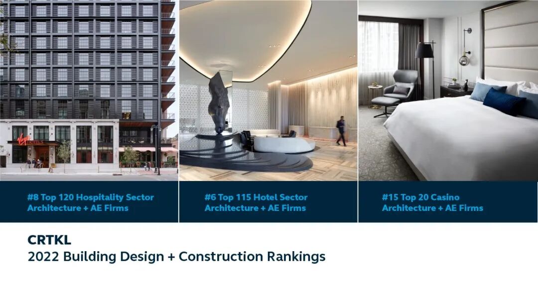 CRTKL在ENR发布的2022年榜单中,位列建筑市场十强榜单第1位;在Building Design + Construction发布的2022年度建筑设计公司180强榜单中位列第7位。