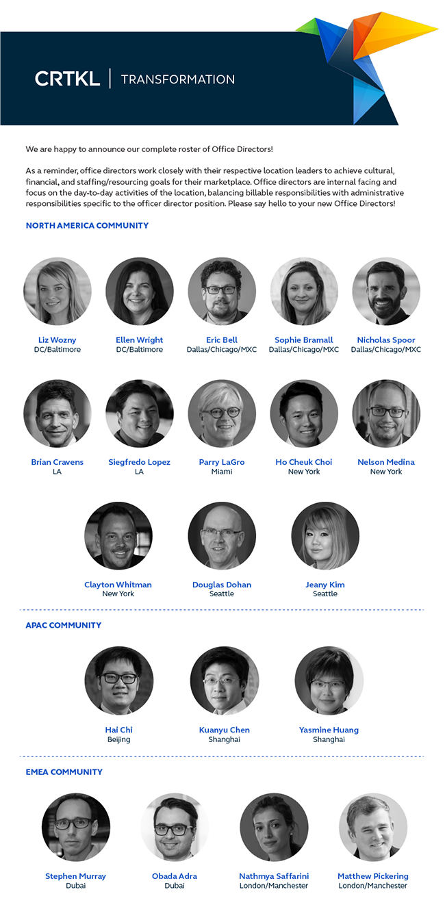 近日,CRTKL任命了北美区、亚太区、欧洲、中东及非洲区共20位办公室负责人,任命池海为北京办公室负责人,陈冠宇、黄莹为上海办公室负责人。办公室负责人通过与各大区的领导层建立密切的合作关系,主要负责内部事务,专注于当地办公室的日常活动,平衡收支工作,以及相关的行政职责,以实现其所在市场的文化、财务、人力资源等目标。