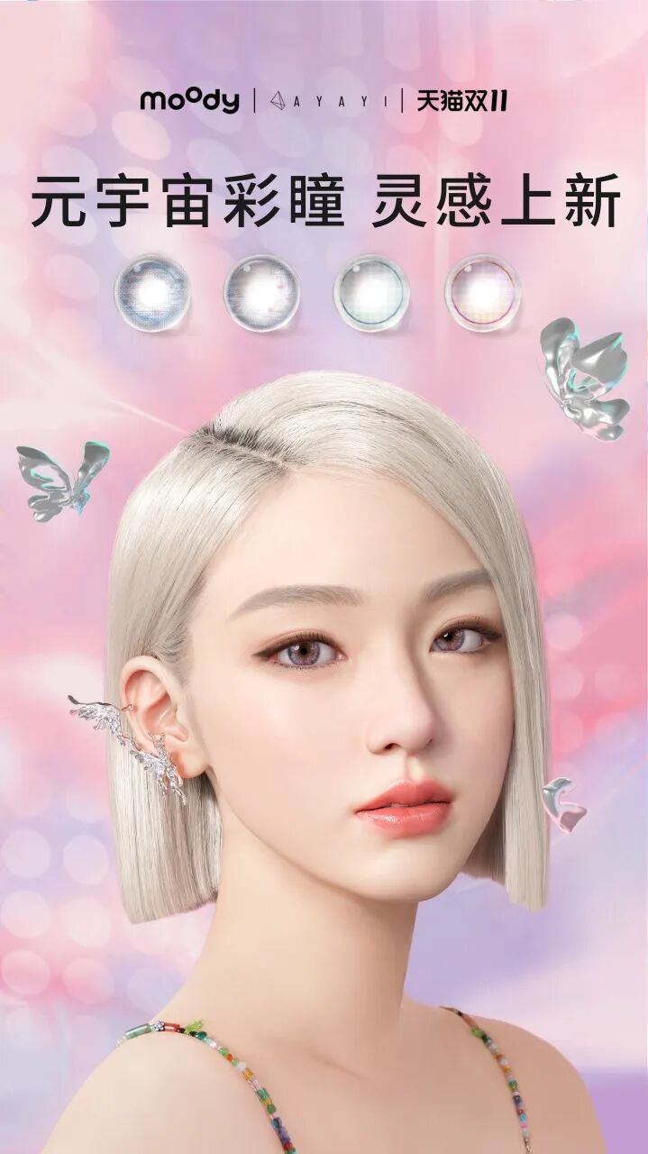 2022年双十一「超瞳™系列」上线4款全新花色,并推出超瞳™系列数字艺术产品概念片。此次上新moody再次构筑不同,升级演绎概念灵感与产品设计,进一步激发对于未来元宇宙的美好想象。以AYAYI在元宇宙的奇遇为灵感,moody又一次突破彩瞳设计壁垒,大胆运用充满想象的故障风、数字蝴蝶、时尚撞色等元素,设计出颇具未来时尚感与元宇宙数字感的彩瞳,通过前沿概念与设计,引领彩瞳潮流新风尚。