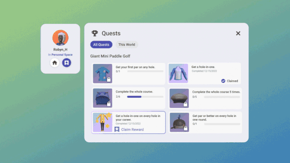 目前,Meta已经在一个名为Giant Mini Paddle Golf的世界推出了相应的测试体验,当玩家在迷你高尔夫球场中完成课程或者相应的任务,便能获得各种航海主题的虚拟服装。而玩家可以通过个人资料页面呼出任务面板,以查看相应的进度。
