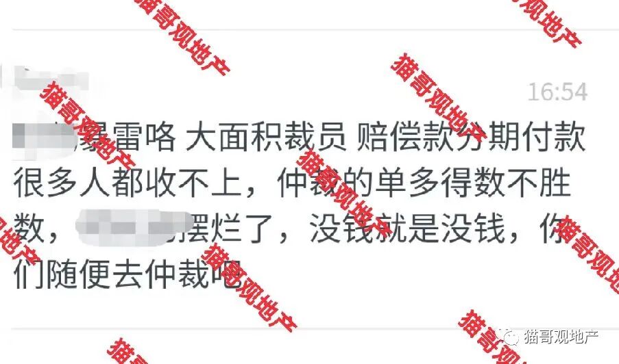 从二季度开始,这家40强品牌房企就开始出现大面积的工资延迟发放,部分区域和条线的工资延迟很久没拿到。后来这个问题愈演愈烈,公司对于具体何时发工资,并没有给出一个明确的时间表,让等待发薪的员工十分焦虑。6月份的时候我们还专门发文讲过,在我们发文以后,这家房企火速把工资发放了。不过,后面工资发放又拖延了。对于欠薪和离职补偿的问题,这家房企的情况确实很严重,不少员工走仲裁也没办法。
