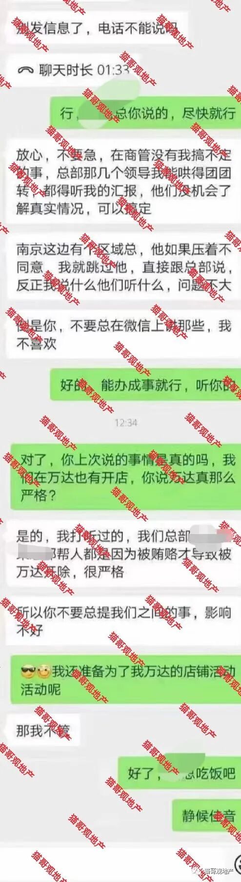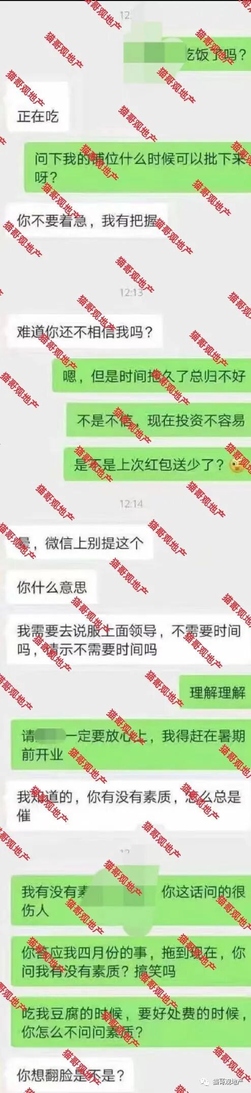 前两天,有知情人士跟猫哥投稿,某40强房企(后台回复:摆烂,获知名字提示)华东的商管公司,负责某个商业的员工,存在严重的腐败问题,并且跟我们提供了聊天记录截图: