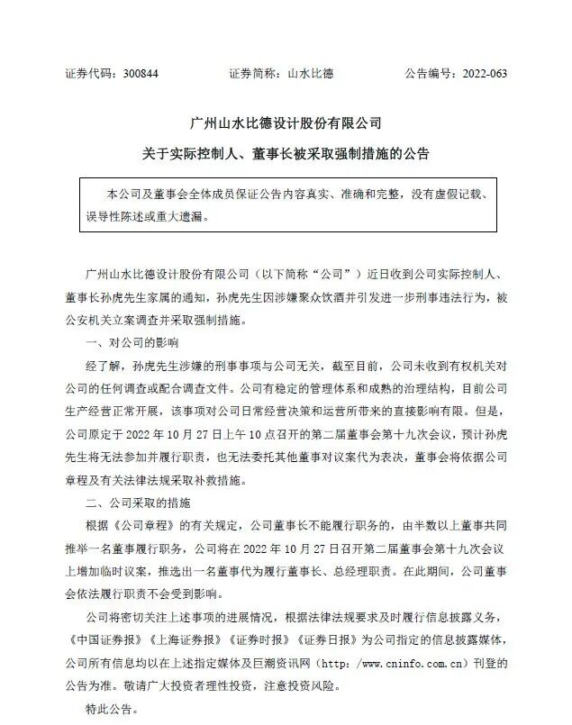 经了解,孙虎先生涉嫌的刑事事项与公司无关,截至目前,公司未收到有权机关对公司的任何调查或配合调查文件。公司有稳定的管理体系和成熟的治理结构,目前公司生产经营正常开展,该事项对公司日常经营决策和运营所带来的直接影响有限。但是,公司原定于 2 022 年 1 0 月 2 7 日上午 1 0 点召开的第二届董事会第十九次会议,预计孙虎先生将无法参加并履行职责,也无法委托其他董事对议案代为表决,董事会将依据公司章程及有关法律法规采取补救措施。