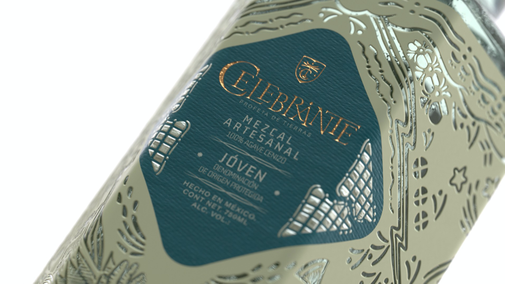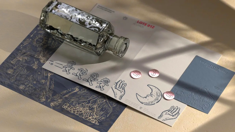 瓶子是多面的,它的每一面都有一个家庭成员,包括太阳和月亮,是创造这种饮料的主要角色。图形标识努力通过其标签讲述整个过程的故事,一个值得分享和解释的标签,是对墨西哥民间聚会和供品中使用的碎纸的重新诠释,是对土地获得的梅斯卡尔的赞美和感谢。