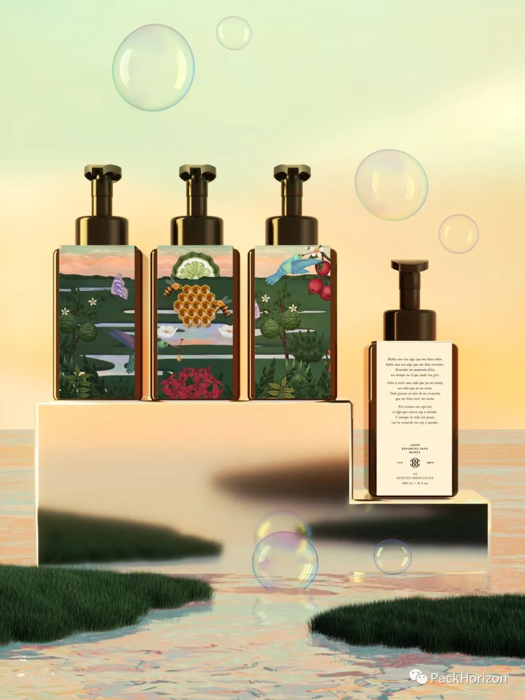 Como Olvidar是一个在墨西哥尤卡坦州生产的泡沫洗手液品牌。受超现实主义艺术的启发,创作了一幅插图,其中包括不同的地区元素和半岛特有的植物。如蜜蜂和蜂鸟,尤卡坦半岛特有的花朵和植物,以及代表太阳升起和夕阳的壮丽色彩的印第安柠檬。