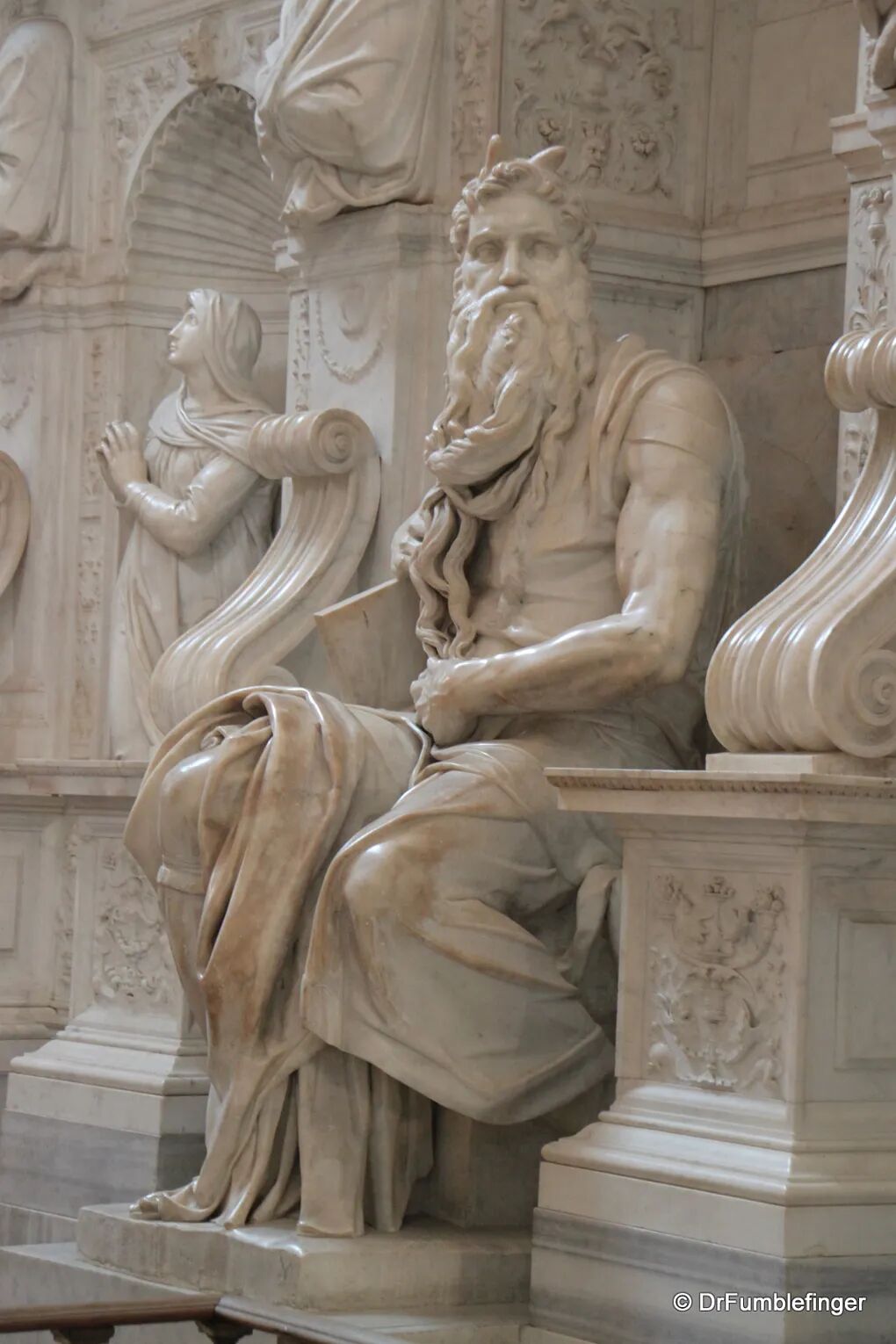 米开朗基罗所创作的摩西,是介乎神人间的超人,体现了一个领袖的神气。他的头威严地竖立着,奕奕有神的目光,曲着的右腿,宛如要举足站起的模样。牙齿咬紧着,像要吞噬什么东西。头上的角,使摩西态度更为奇特、怪异、粗野,是力量的象征。