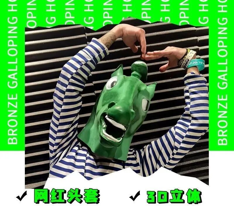 另一个出圈儿的就是「绿马头套」了,无论是表情还是配色都非常滑稽,与目前大火的绿头鱼头套有异曲同工之妙,非常符合现在年轻人喜欢搞怪的个性。