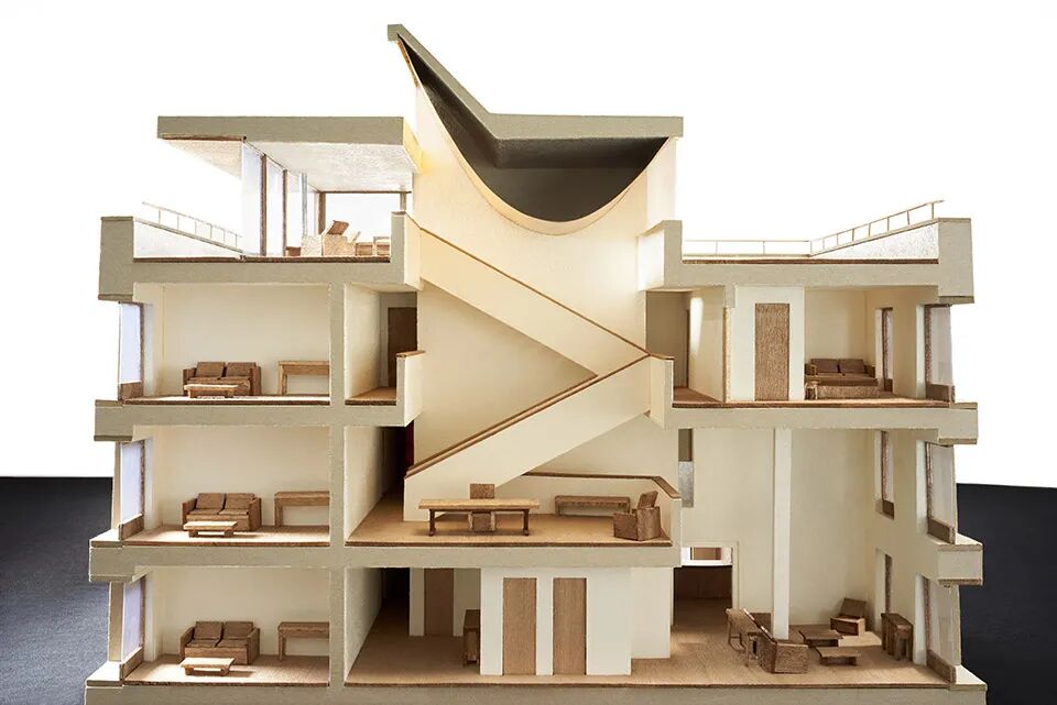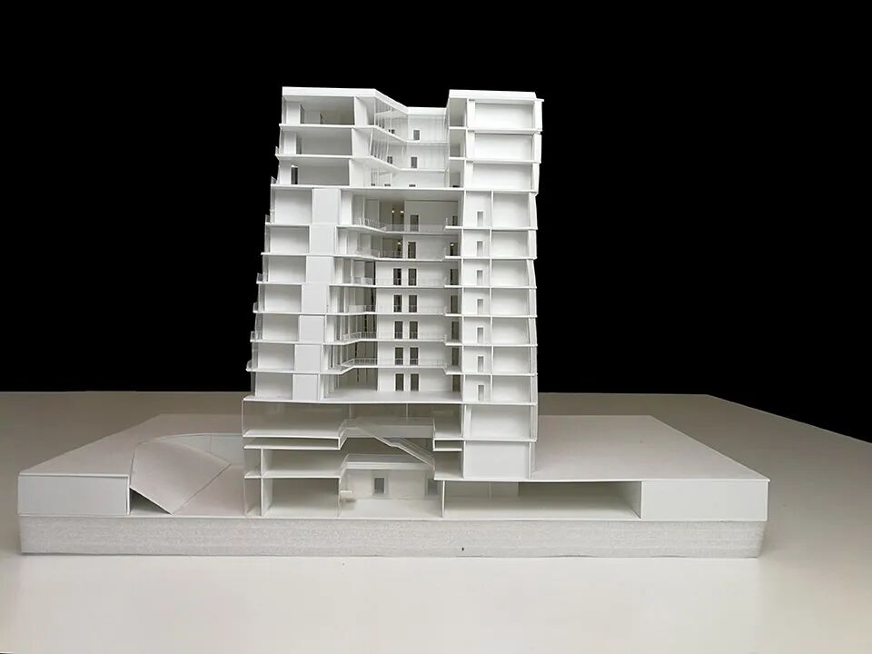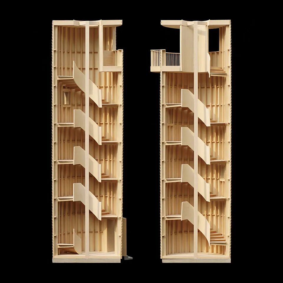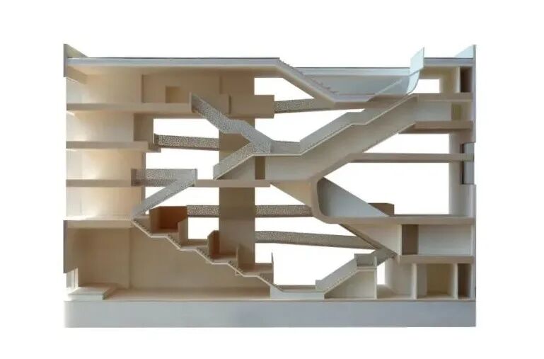 作品集2023-04-12 模型赏析:建筑剖面模型 剖面模型 01 名称:维也纳KaDeWe商场设计竞赛方案 设计:OMA事务所 设计记录 OMA对柏林的KaDeWe进行了翻修,项目的实体与绿色缓冲区相连,展现了一系列公共屋顶花园,并在主要功能之间建立了通道。这座建筑不是一个简单的图标,而是一种通过自身内部组织建立新的城市联系和公共空间的建筑装置。关于绿色元素的构成,OMA意在实现“花园的品质和特色各不相同——从树丛到日光浴平台——从建筑物的各个侧面都能看到前所未见的城市风景”的效果。 02 名称:SR银行新总部 设计:Hermann Blümer 设计记录 建筑的平面布局围绕中庭展开,将光、空气和绿色植物引入室内。各种非正式的集会场所都面向中庭,作为沿建筑物外立面安静工作场所布置的缓冲地带。中庭内的木质开放走廊有机地盘旋其中,与外立面三角形的建筑体量形成对比。考虑到木材对未来工作空间体验和品质的积极影响,建筑师从一开始就打算以木材作为主要结构。木材作为一种可持续性材料,为BREEAM-NOR绿色建筑认证奠定了基础。 03 名称:梅里雪山既下山酒店 设计:赵扬建筑工作室 设计记录 从冬季保温的角度出发,把原建筑的天井覆盖为中庭。为了改变大堂幽暗压抑的状态,先去除中庭部分二楼的楼板,改善了大堂进深和层高的比例关系;然后,鉴于到四层高的中庭过于高耸,把中庭部分的地面抬升到第二层,并把该空间设计作图书馆使用。大堂和图书馆空间因此在剖面上联系起来,到达大堂的客人比较容易的被高处的中庭吸引而开始一段向上的空间游历。最后,用三段直跑楼梯把地面层的大堂,二层的图书馆和四层的酒吧连接起来。 04 名称:泰山九女峰泡池及配套设施 设计:赵扬建筑工作室 设计记录 九女峰泡池是对自然的一次策略性回应,是关乎整个衰败村落重获新生的关键“穴位”——亟待更新的原始贫困村落与世界级的壮阔美景,泡池位处二者之间,以其纯洁、通透、流动的观感平衡两种空间气质。为实现泡池平地而起的生长状态和通白流畅的造型特点,施工过程平衡建筑与景观、室内的关系,相辅相成,构造与材料则做到尽可能的简化。设计回应漫山林杪与壮阔天色,对话泰山萦回百折的自然脉络,如遗落在层层石磴之间的云海珍贝。 05 名称:天鹅湖湿地公园景观廊及观鸟塔 设计:迹·建筑事务所(TAO) 设计记录 观鸟塔因其纯粹的功能要求,设计的重点便是如何营造游览过程中的体验和氛围。从外部看,塔的整体较为封闭,材料为木瓦片,这种材料经历日照和气候影响,瓦片颜色会由原木色逐渐变为灰色,呈现出更为静谧的气质。木塔内部的主要光源来自屋顶中心的天光,因此建筑空间整体呈现出从低到高逐渐由暗变亮的状态。 06 名称:崇明体育训练基地一期项目1,2,3号楼 设计:麟和建筑工作室 设计记录 中庭空间采用了热力学烟囱机理,借助空间竖井与顶部的太阳能加热板,实现自然通风组织。针对夏热冬冷,夏季较为潮湿、日照较强的气候特征,建筑内部各个空间通过与中庭的季节性、时段性策略相结合,在整体系统中实现了复合、多层次的环境性能设计。 07 名称:双层楼 设计:Studio Velocity 设计记录 设计中小卧室和浴室放置在一层,它们通过一个厅相联系。这些房间中除了卫生间,每间又都有单独的楼梯间通往二层。二层是入口层,人们需要从室外上楼梯到二层,进入建筑。二层高高的天花板上开着一些大小不一的天窗,这里十分明亮。空间就散布在楼梯间的空隙处。空间像是在一个小镇的街道上,楼梯间则是街道上的建筑。 08 名称:二七厂1897科创城展示中心厂房改造 设计:普罗建筑 设计记录 两部分主要的功能被垂直分区。一层为公共路演区,二三层为展示洽谈办公区。路演区为一个三层通高的中部空间,承载座位功能的大楼梯从天空上倾泻而下,上面正对着屋顶中部的天窗。这部分感受到新植入的空间包裹着原始的旧空间,成为了原始空间的“意义上的外部”。在楼梯对面可以看到一条环形的白色物体悬浮于厂房的中部。它与原始厂房的墙面完全脱开,这个白色的异质物就像漂浮在老建筑的外壳里,同时它又是人们使用整个空间的线索和发动机。盒子上面有条形的开口隐约看到内部的景象,白色物体上下都露出原始厂房的墙体,在这里,感觉厂房作为一个整体,将植入的物体包裹起来,再次形成了“意义上的外部”。 09 名称:皇后区图书馆猎人角馆 设计:Steven Holl建筑师事务所 设计记录 图书馆被分为少儿区、青少年区和成人区,分别对应建筑东立面不同的开洞。建筑内部的功能衔接流畅,平面布局紧凑,从建筑的剖面可以看到内部空间开放而流动,符合大多数的节能设计要求。这样的布局也为室外公共绿地留出了尽可能多的空间。 10 名称:云南东风韵艺术中心 设计:孟凡浩-line+建筑事务所 设计记录 顺应场地南北向自然高差的中庭大台阶,衔接起了首层与负一层空间,并形成了就势而建的公共演艺与书吧空间,观者在这里可以充分享受阳光,感受内外间的自然渗透。 11 名称:西安秦始皇帝陵铜车马博物馆 设计:上海中森止境设计工作室 设计记录 设计没有采用秦代建筑中常见的砖、瓦或木材,其用意明确。这不是模拟地下墓穴的仿传统空间,建筑界面不要用易引起误读的考古信息干扰对主题的关注;这是一座二十一世纪的新建筑,鼓励用当代视角和恰当