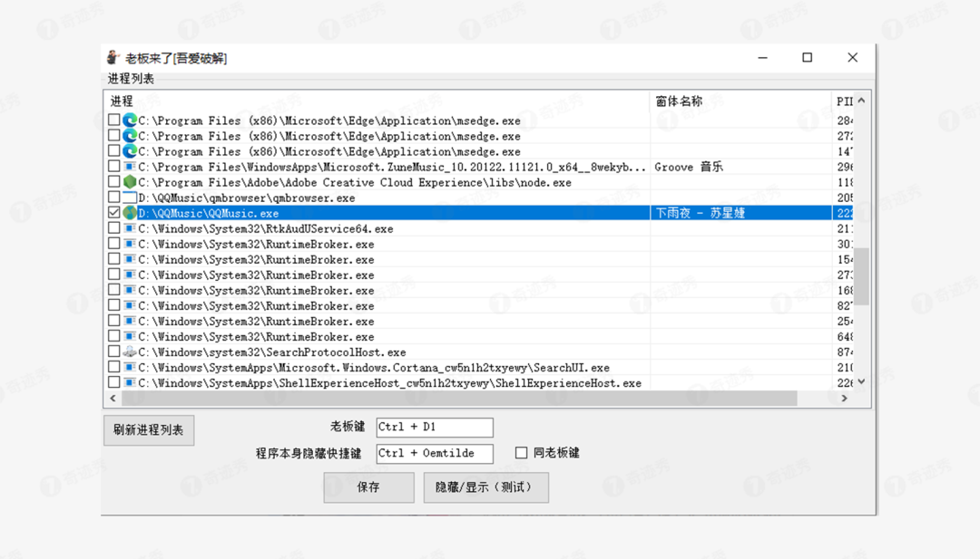 2.使用方法也很简单,运行软件,它就会检测你电脑上安装的所有运行中的程序,选中需要隐藏的程序将其勾选,再设置一个老板键(当然怎么方便熟练就怎么设置老板键是用于隐藏目标程序,下面是设置用于隐藏软件本身快捷键。