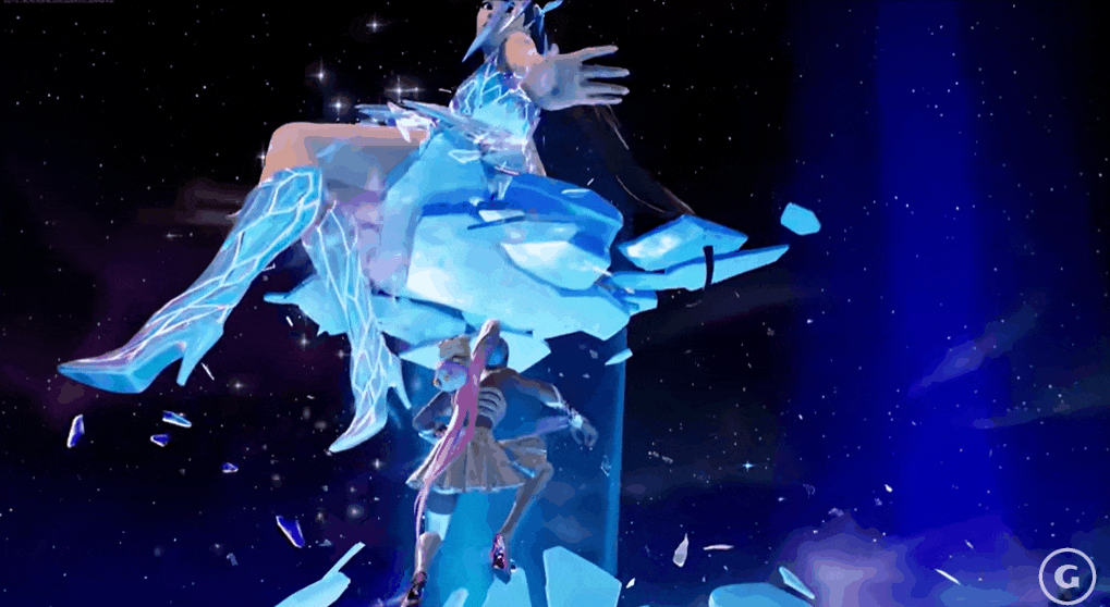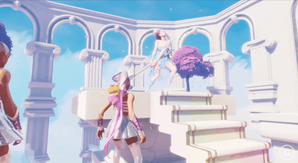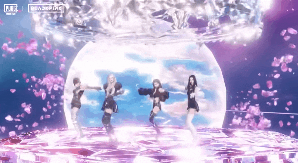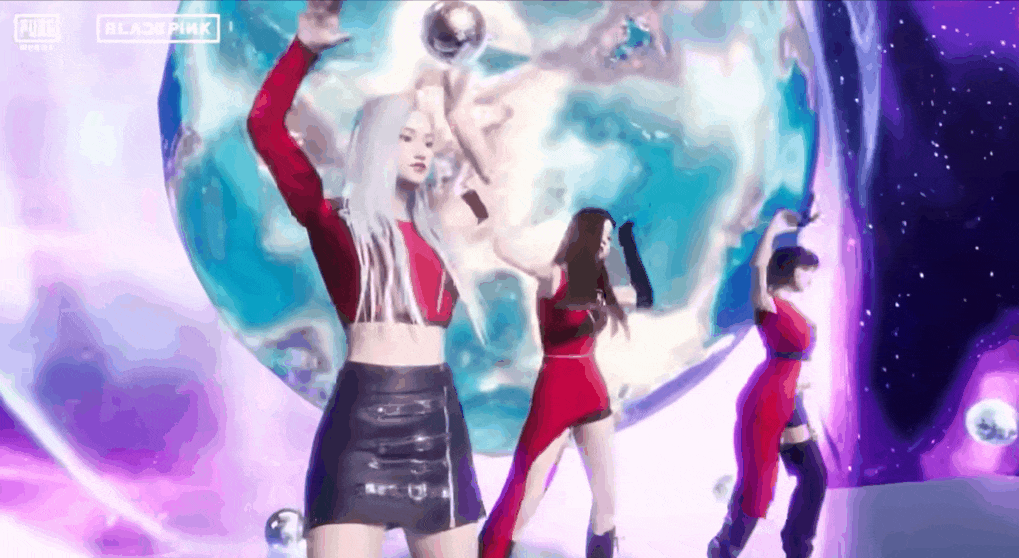 BLACKPINK 的表演更加算是比较传统的舞台式演出,玩家站在虚拟舞台下面,可以看到舞台上巨大的 BLACKPINK 的虚拟化身进行表演,前半段可以进行少量的互动,途中会被传输到一个漂浮在空中的泡泡里。