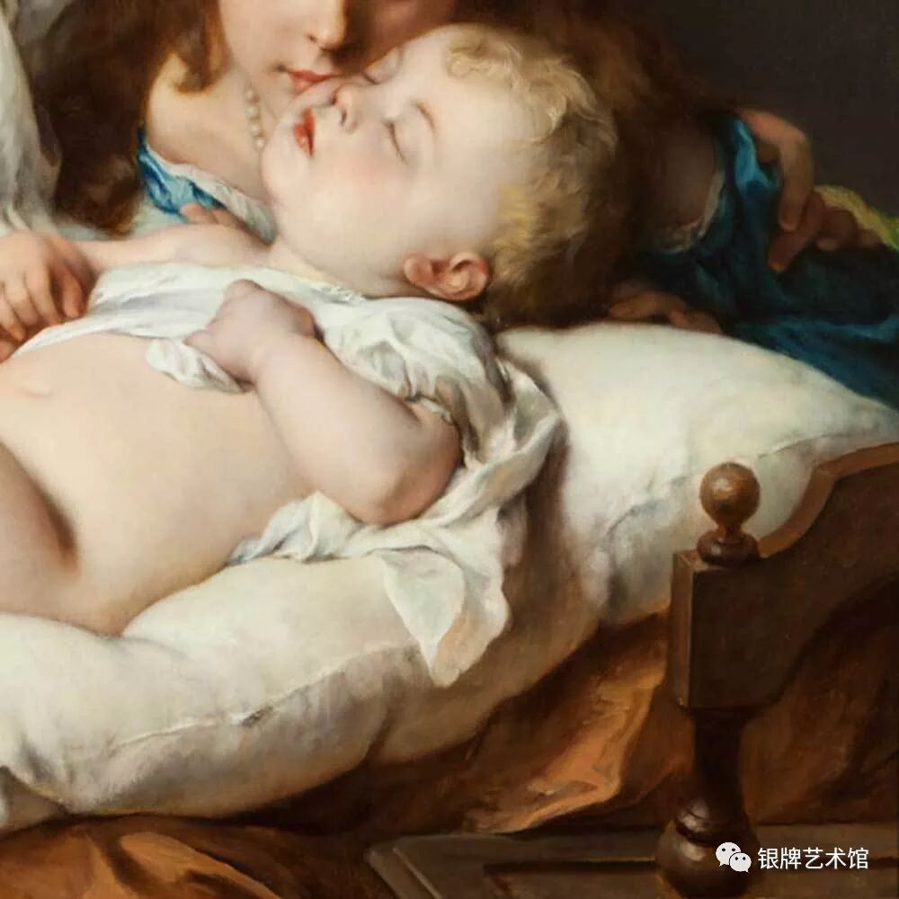 画家笔下熟睡的婴儿被绘制的非常可爱,白白胖胖的手臂曲卷着,圆润的小脚丫和鼓鼓的小肚皮占据了这幅画的中心醒目位置,母亲慈祥的目光注视下,母爱主题被渲染得布满整个画卷。
