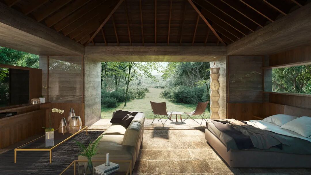 卧室的设计同样个性且自然气息浓厚,大面积的开窗将室外绿植引入,无形之中增加了一种生活意境。