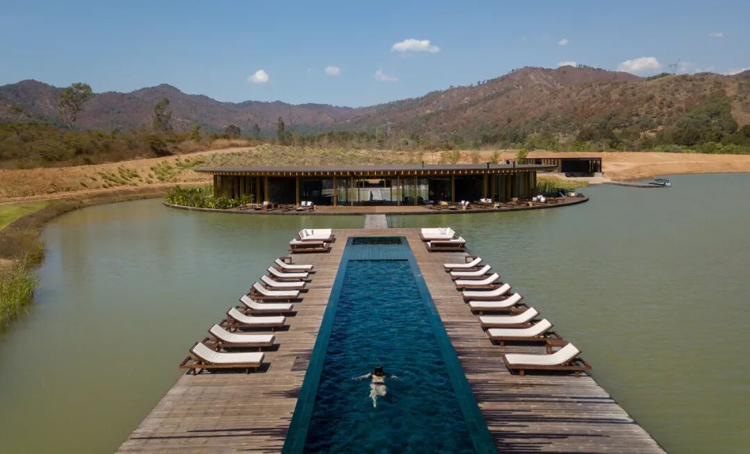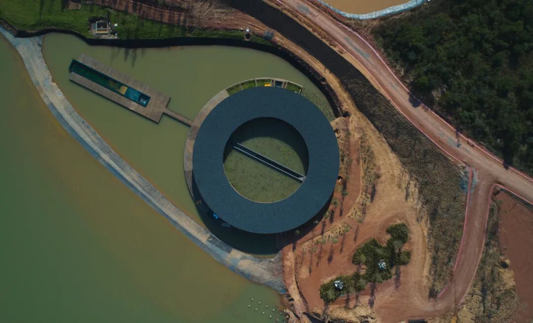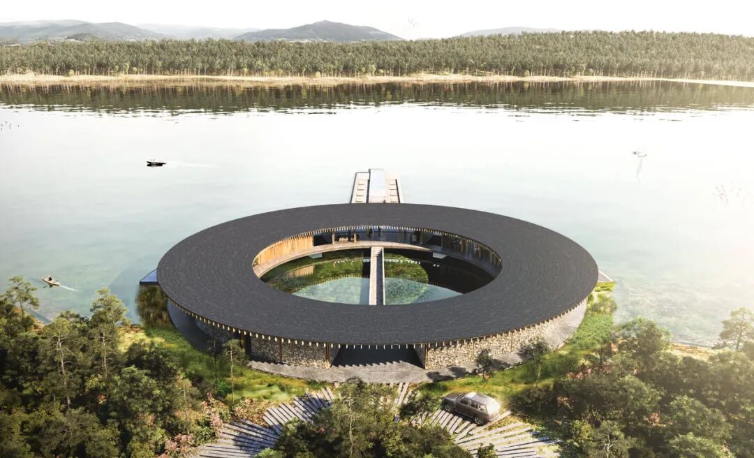在这个创新方案里,除了有依山傍水的住宅外,配套设施也很丰富。首先从这个刚建成的俱乐部会所说起,会所的占地面积为 4500㎡,由 Sordo Madaleno 设计,整体建筑突出了两个自然理念「山和湖」,圆环的造型概念参照的是一艘停泊在湖中的船。