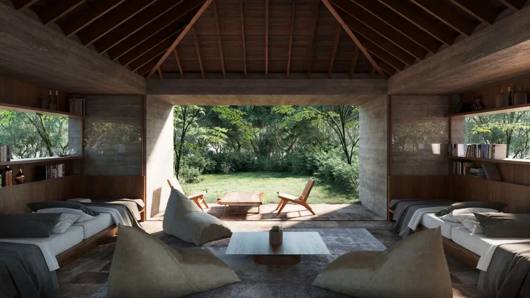 室内四张床分别位于室内两侧,中间区域摆放懒人沙发与方形茶几。