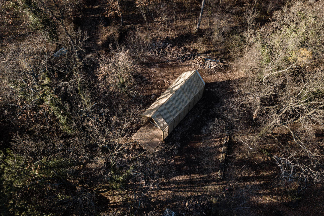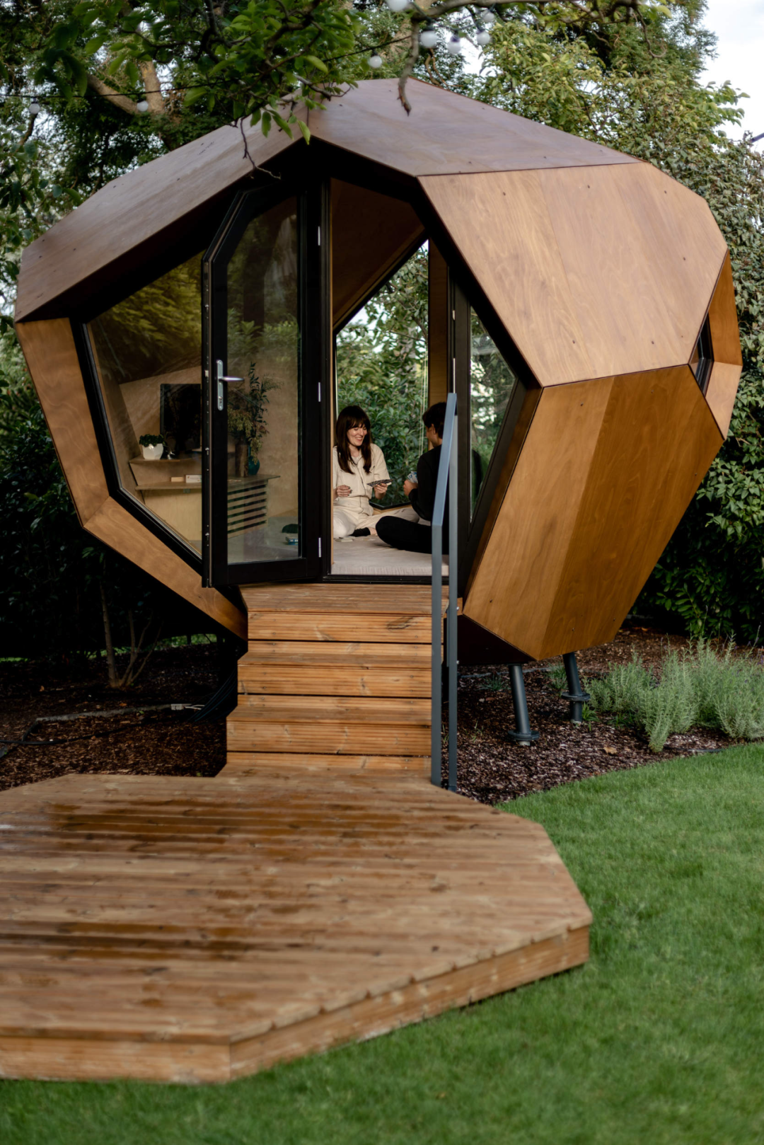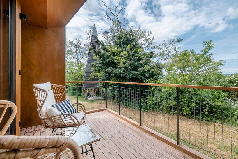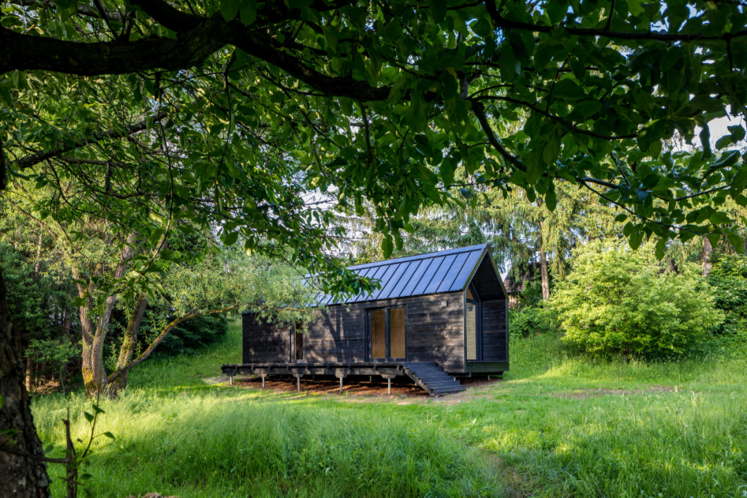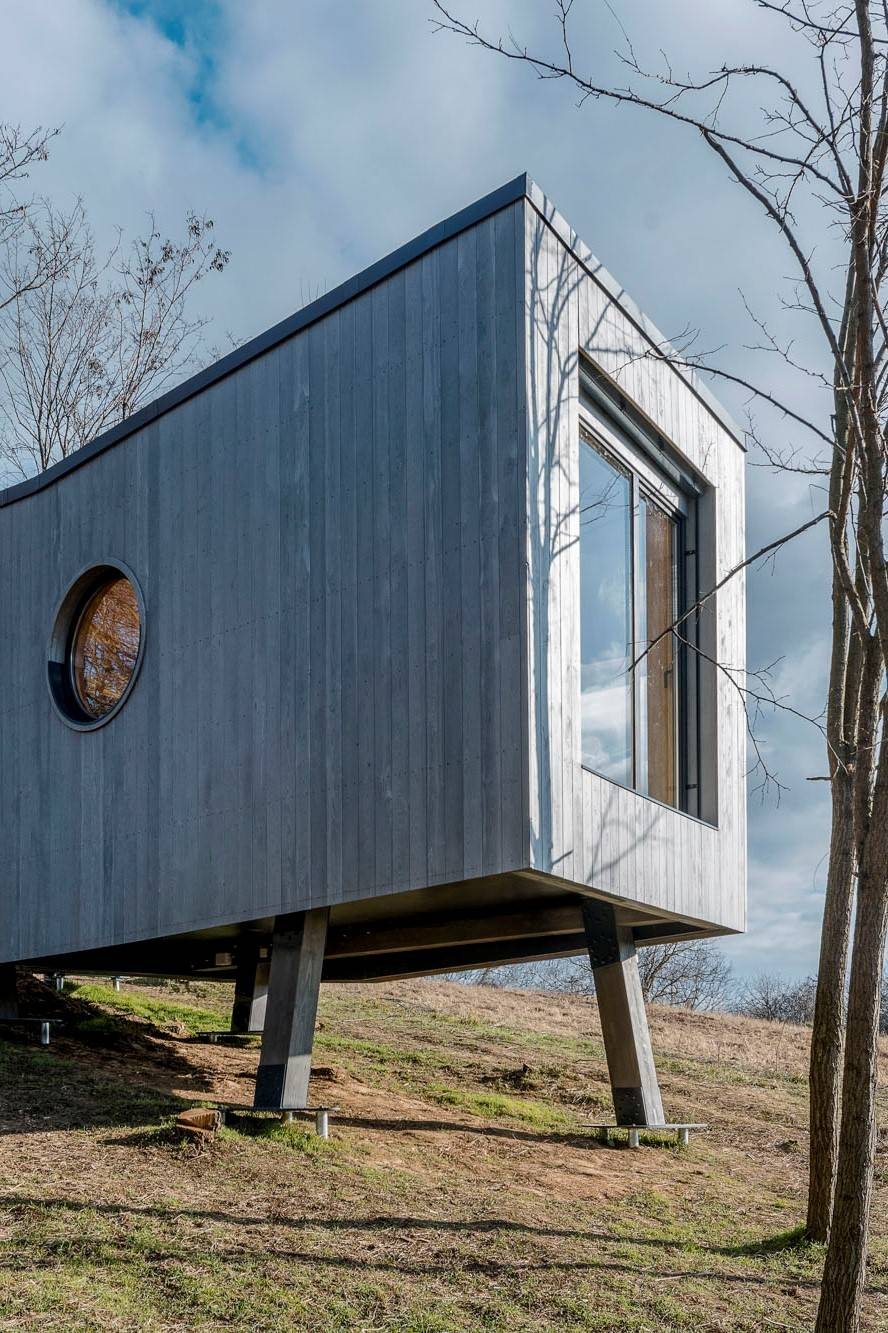 小屋从设计到制造都是在匈牙利完成,黑色的立面在绿植背景下清晰显现。