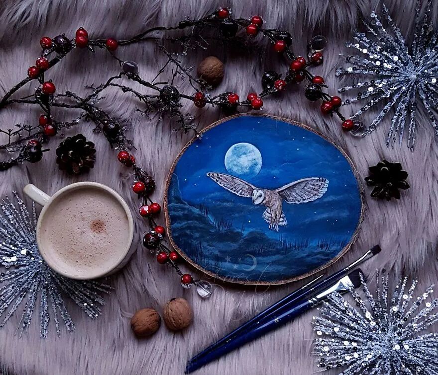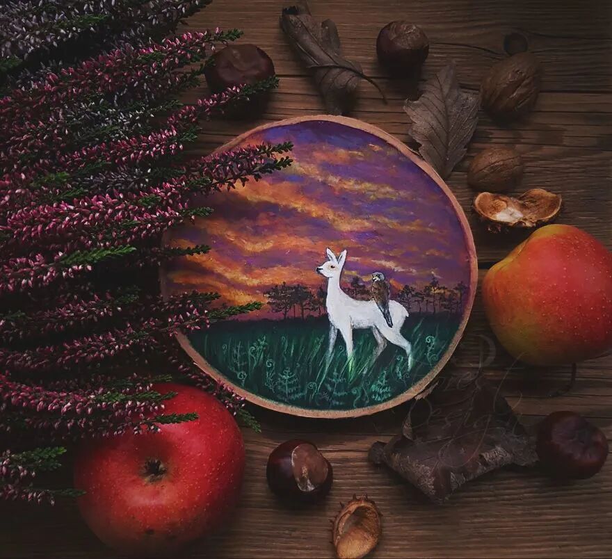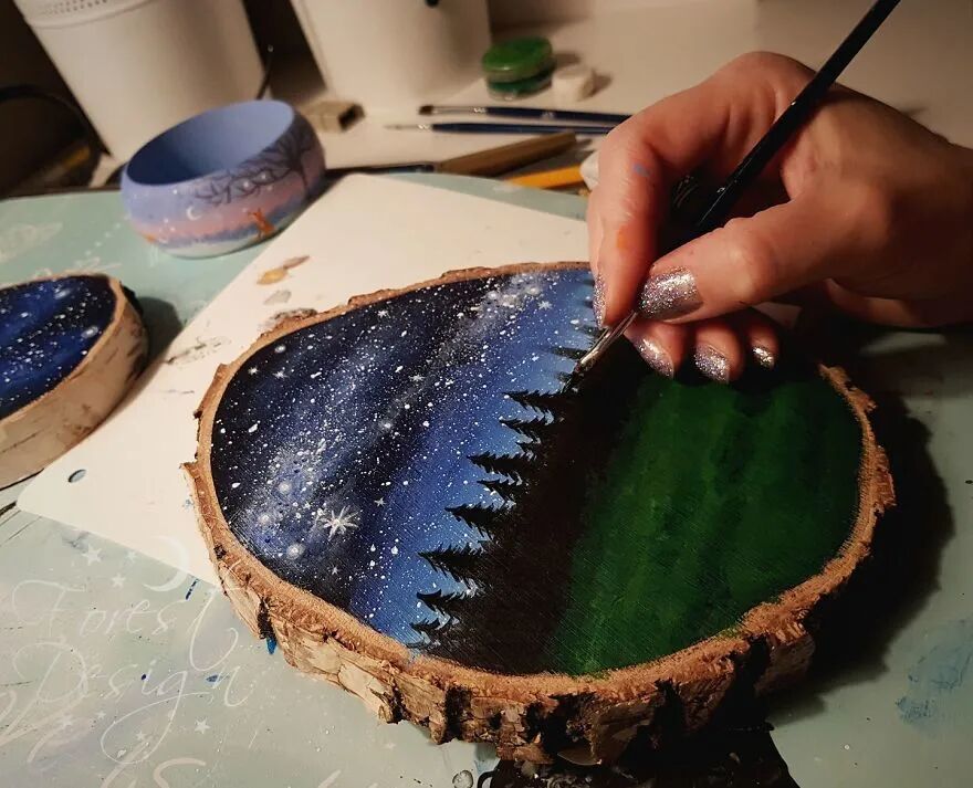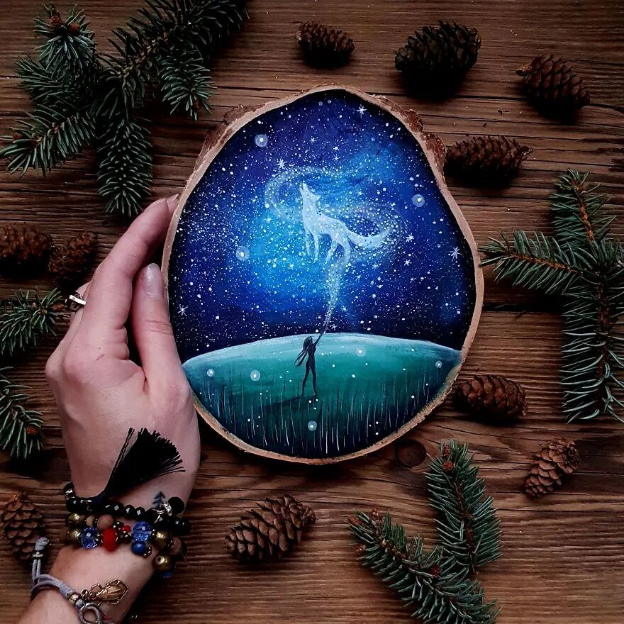 于是,她决定将艺术激情与这种美妙的天然材料结合起来,创作带有大自然气息的艺术作品,开始尝试在木片上画画。安娜从大自然、森林、荒野、宇宙等方方面面来寻找创作灵感,创作出的木头画也涵盖了各种各样的主题,有星空月色,植物动物,童年记忆,童话传说等等。