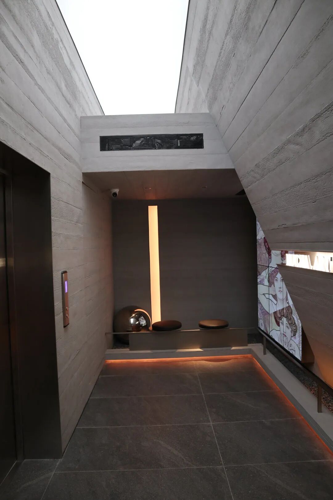 展馆用统一艺术漆刷出灰色基调,搭配部分稀有石材装饰,看上去装严肃穆。充满几何感的斜面墙体设计呈现出现代艺术空间的气质,让整个美术馆显得平静安稳,也能让人静下心来参观。
