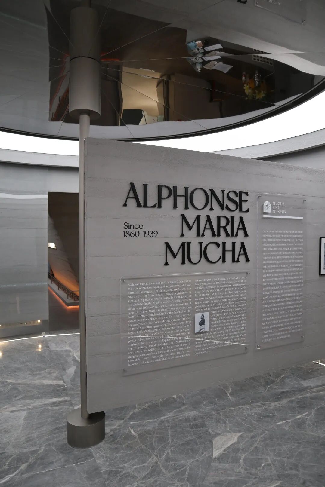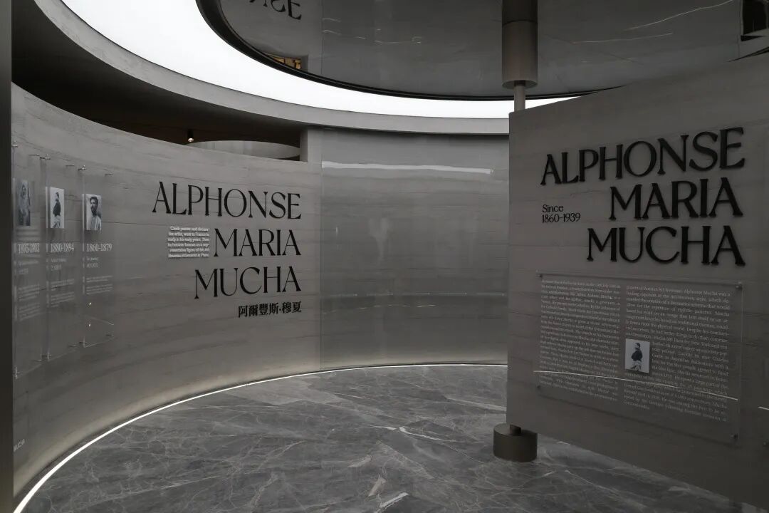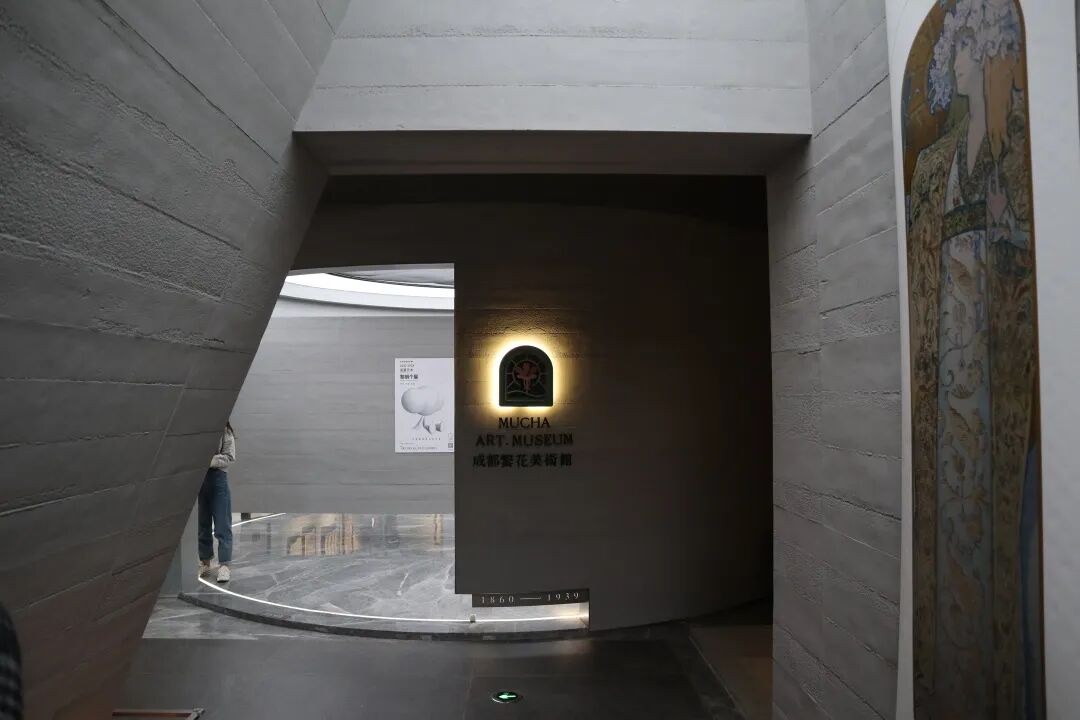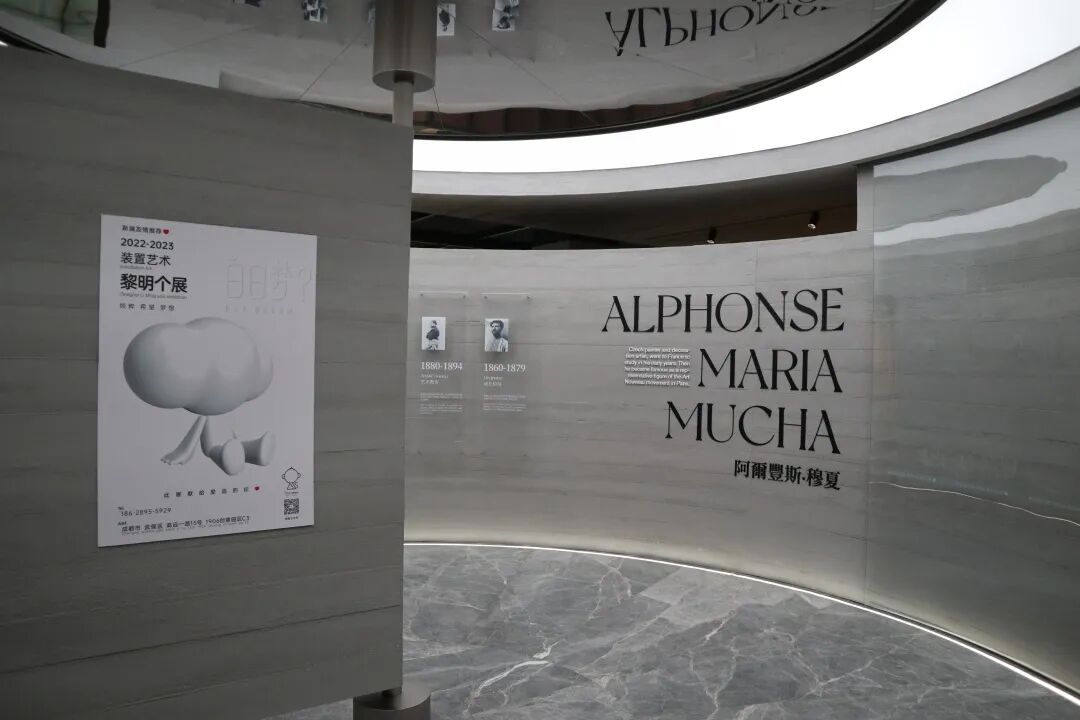 穿过一个充满科技感的蓝色通道,乘坐电梯到达四楼,便是穆夏美术馆展区。展区由西南设计团队WED打造,美术馆创始团队「繁花家族」也参与其中。