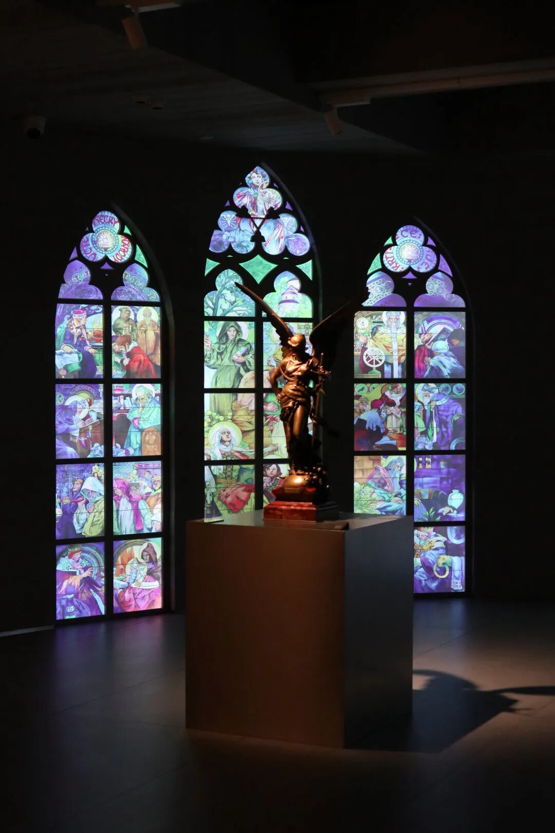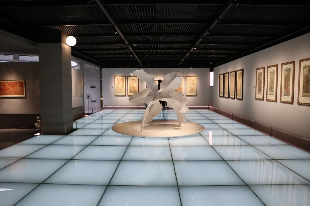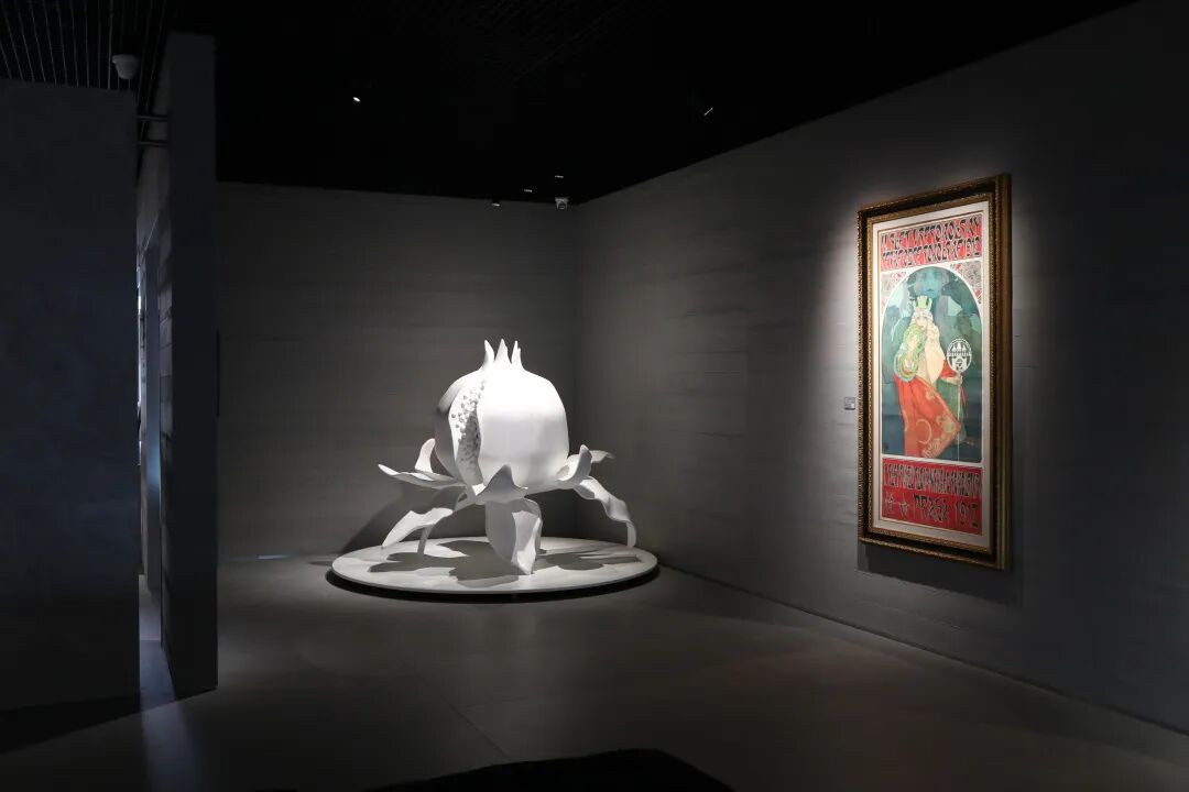 穿过一个充满科技感的蓝色通道,乘坐电梯到达四楼,便是穆夏美术馆展区。展区由西南设计团队WED打造,美术馆创始团队「繁花家族」也参与其中。