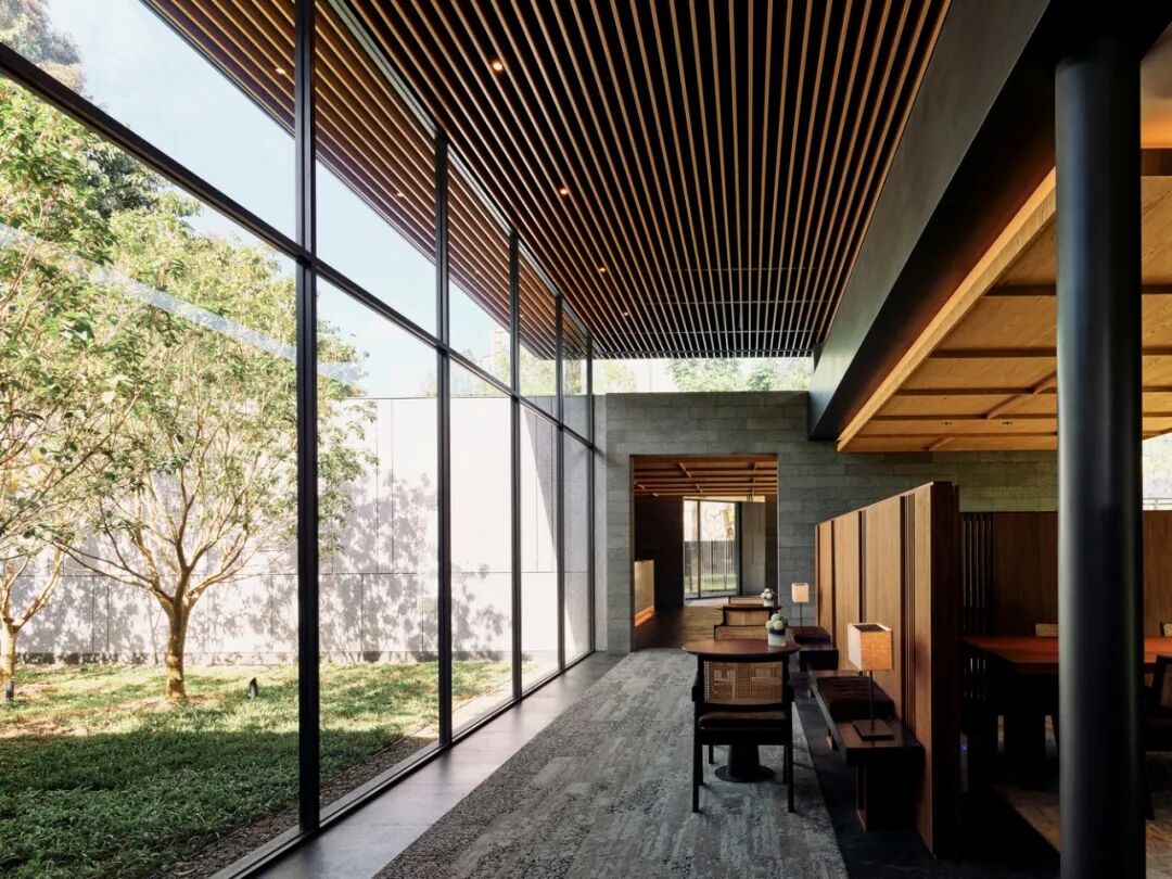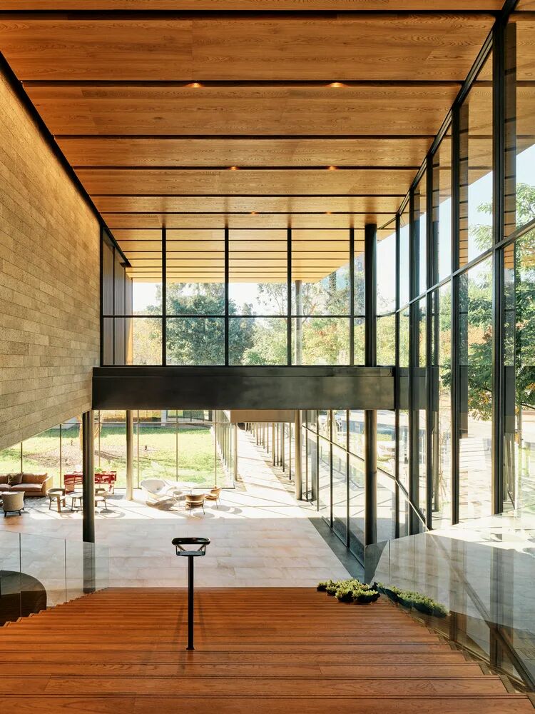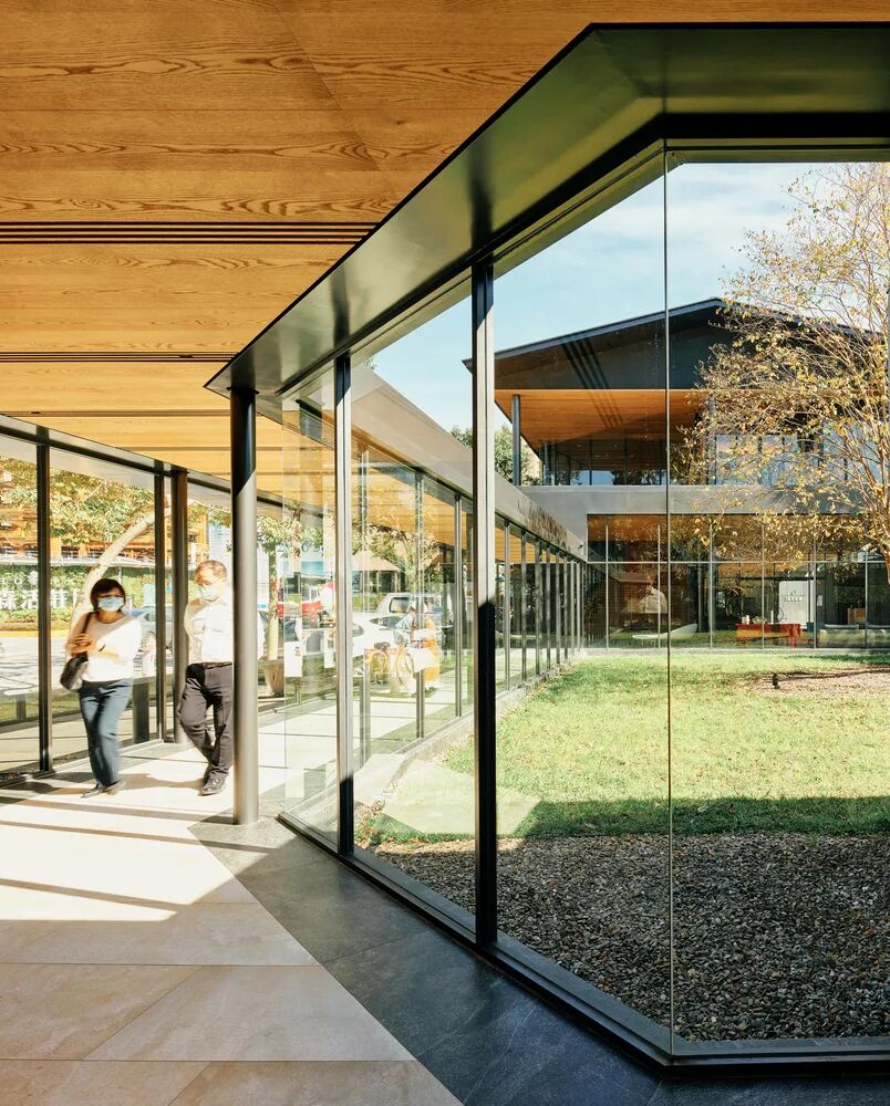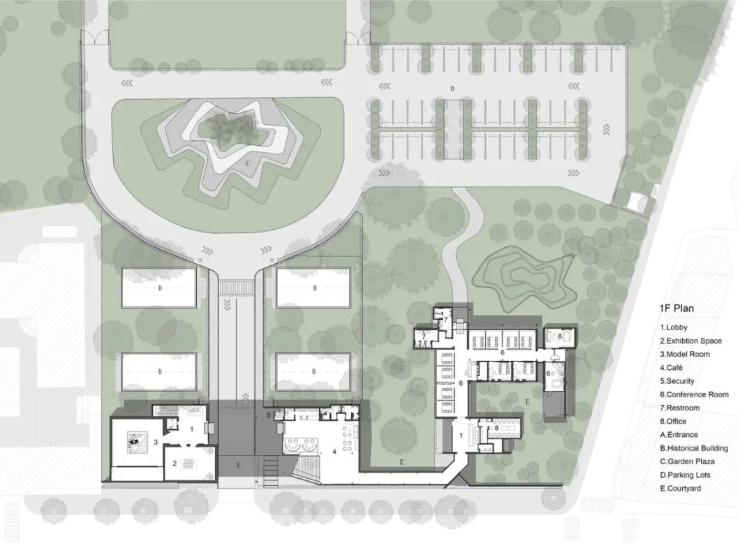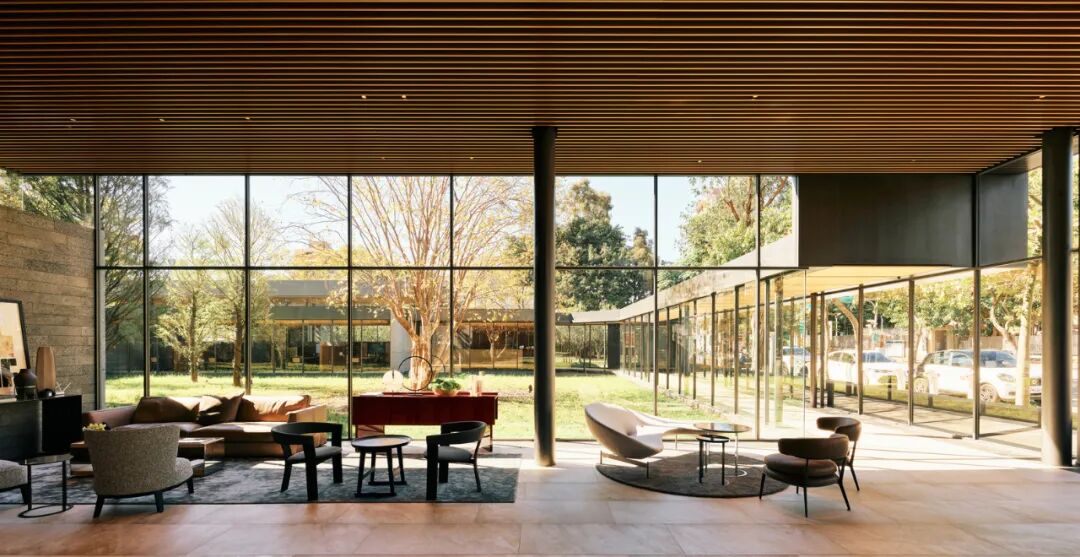 坐落在走廊尽头的是接待台和办公室。再往里走是会议室,包括公共和私人空间。会议室被玻璃墙包围,错层屋顶能让阳光进入,这使人们可以享受到室内和室外的环境。建筑背后的出口通过一条石子路将该区域与停车场连接起来,使游客可以享受到高效且完整的游览体验。