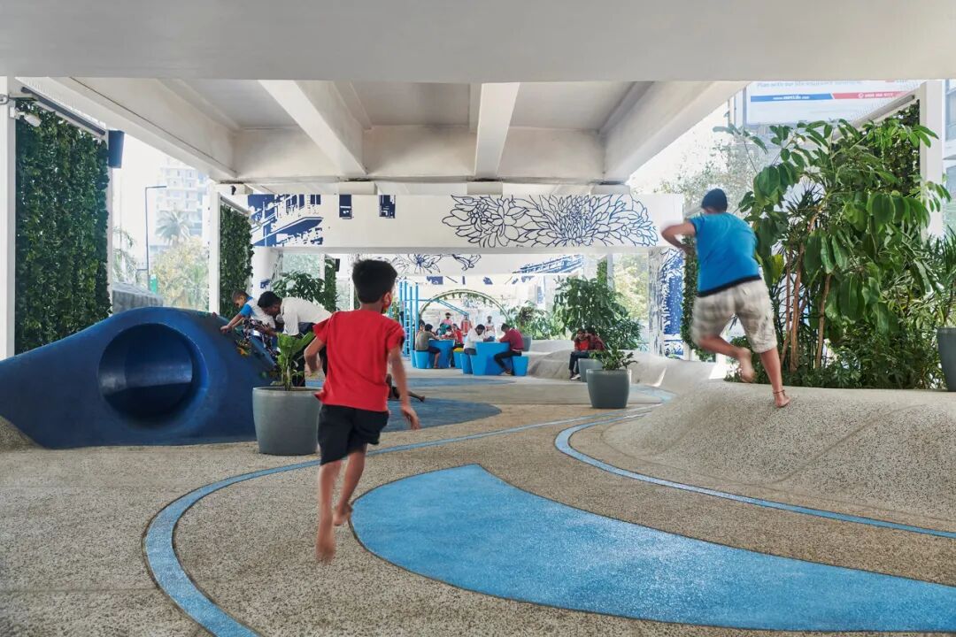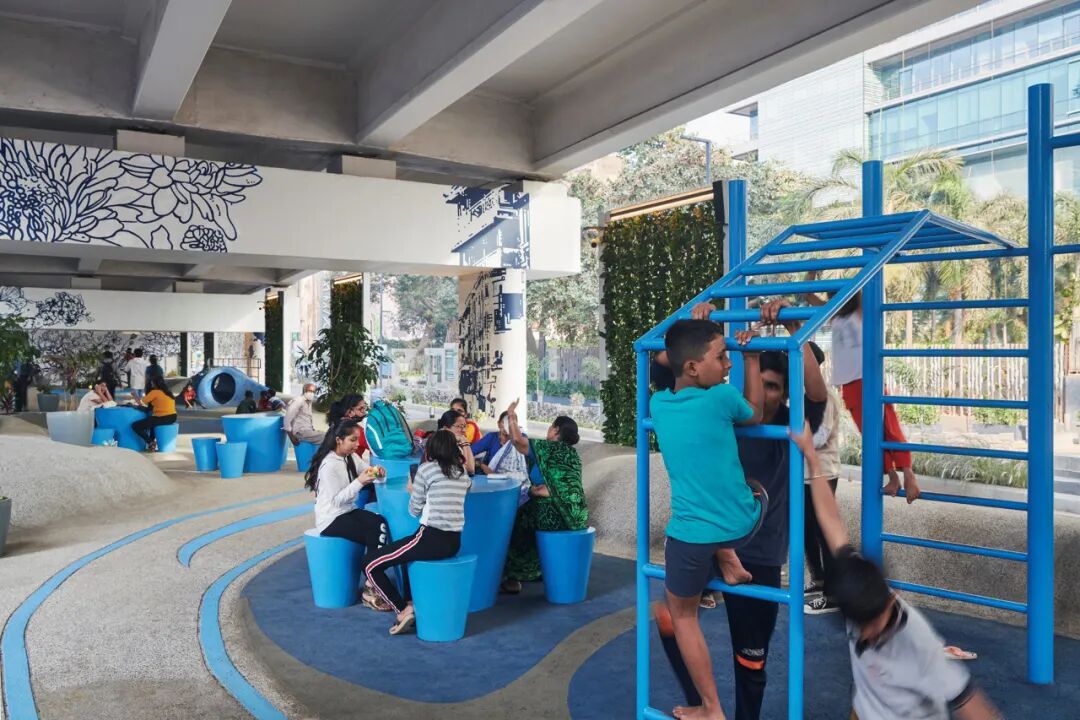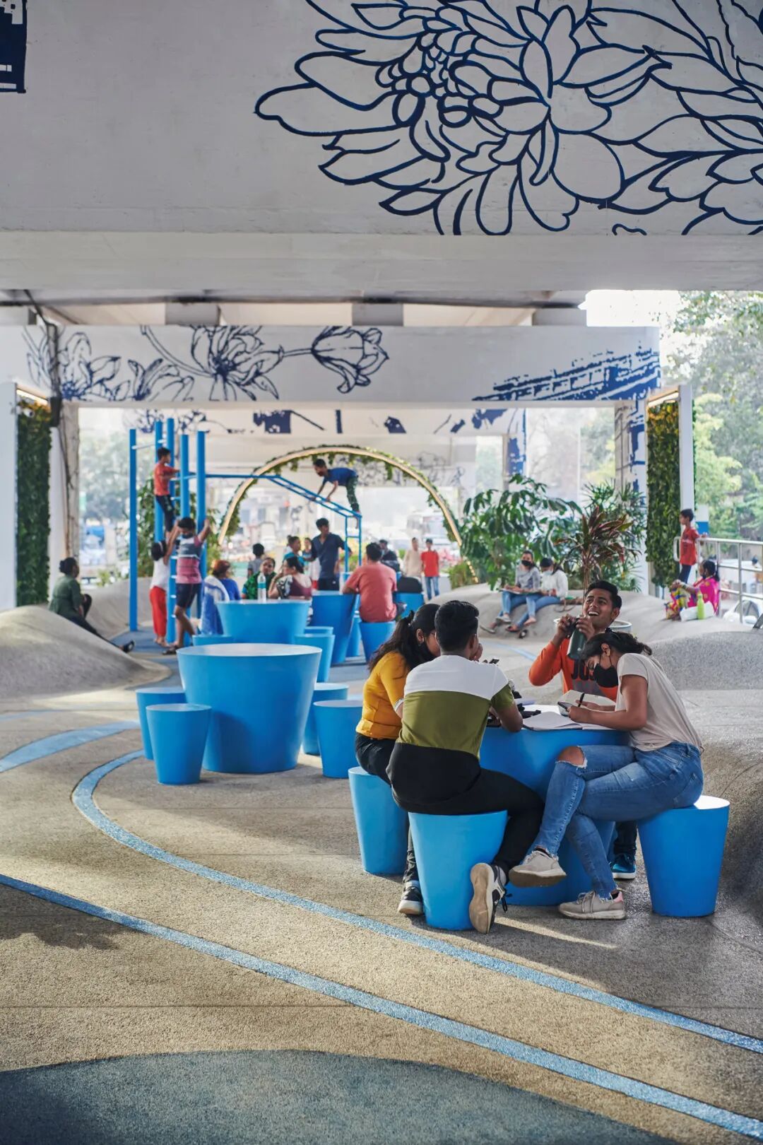 MVRDV 与孟买本地设计事务所StudioPOD 共同完成了「绿里乐园 One Green Mile」项目,改造印度孟买Senapati Bapat Marg 高架桥下方大面积的闲置空间。项目将混凝土构筑的基础设施转变成服务于当地社区的公共空间,增加了社区急需的便利设施和绿化区域,提高了交通流动性,为社区赋予更强的识别度。这一概念可以广泛应用于相同类型的空间,为城市的可持续发展提供了一种可复制的开发手法,同时也为在印度高密度大城市中闲置空间的转型改造树立了新的典范。