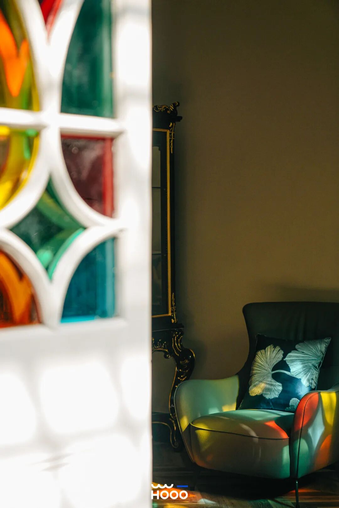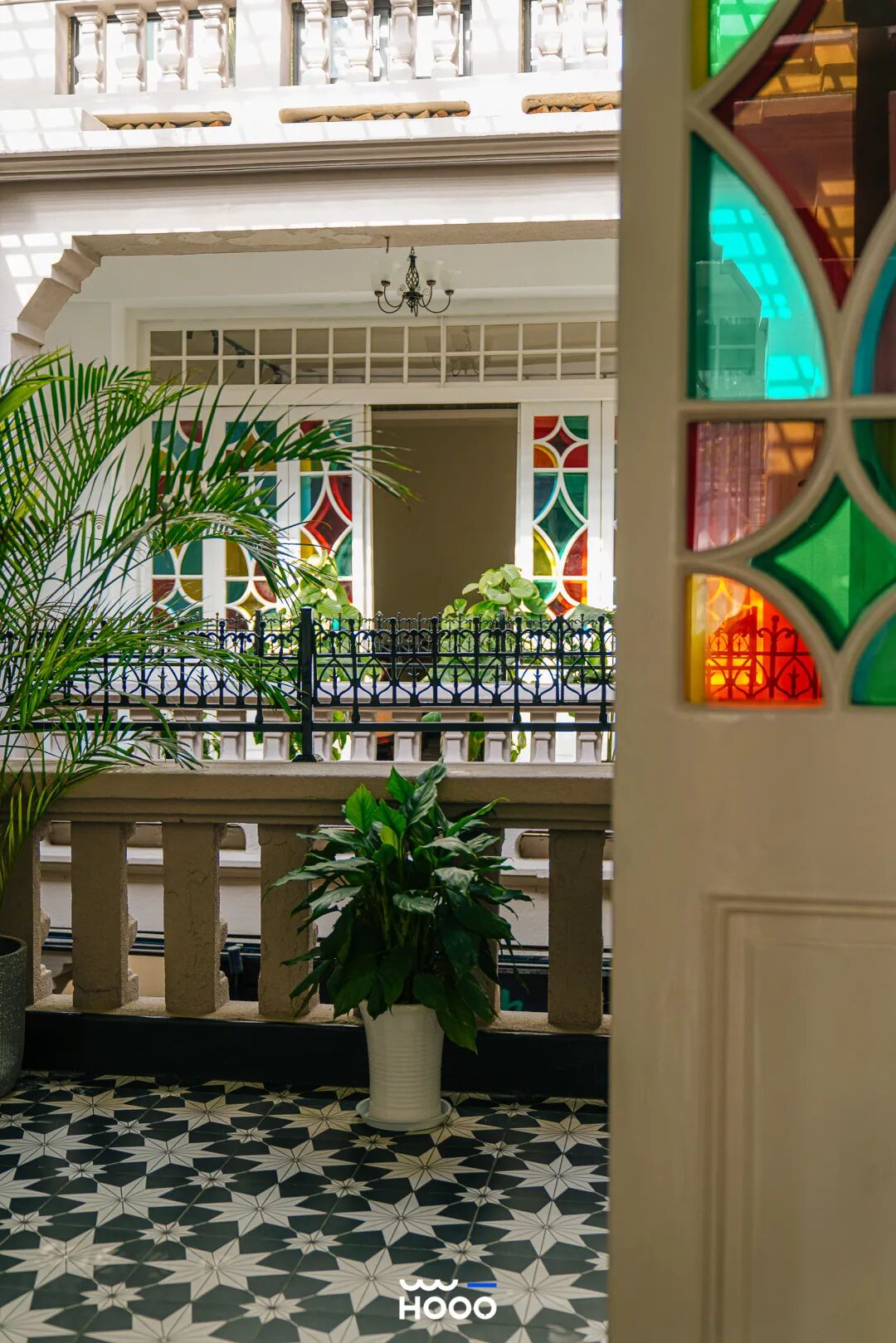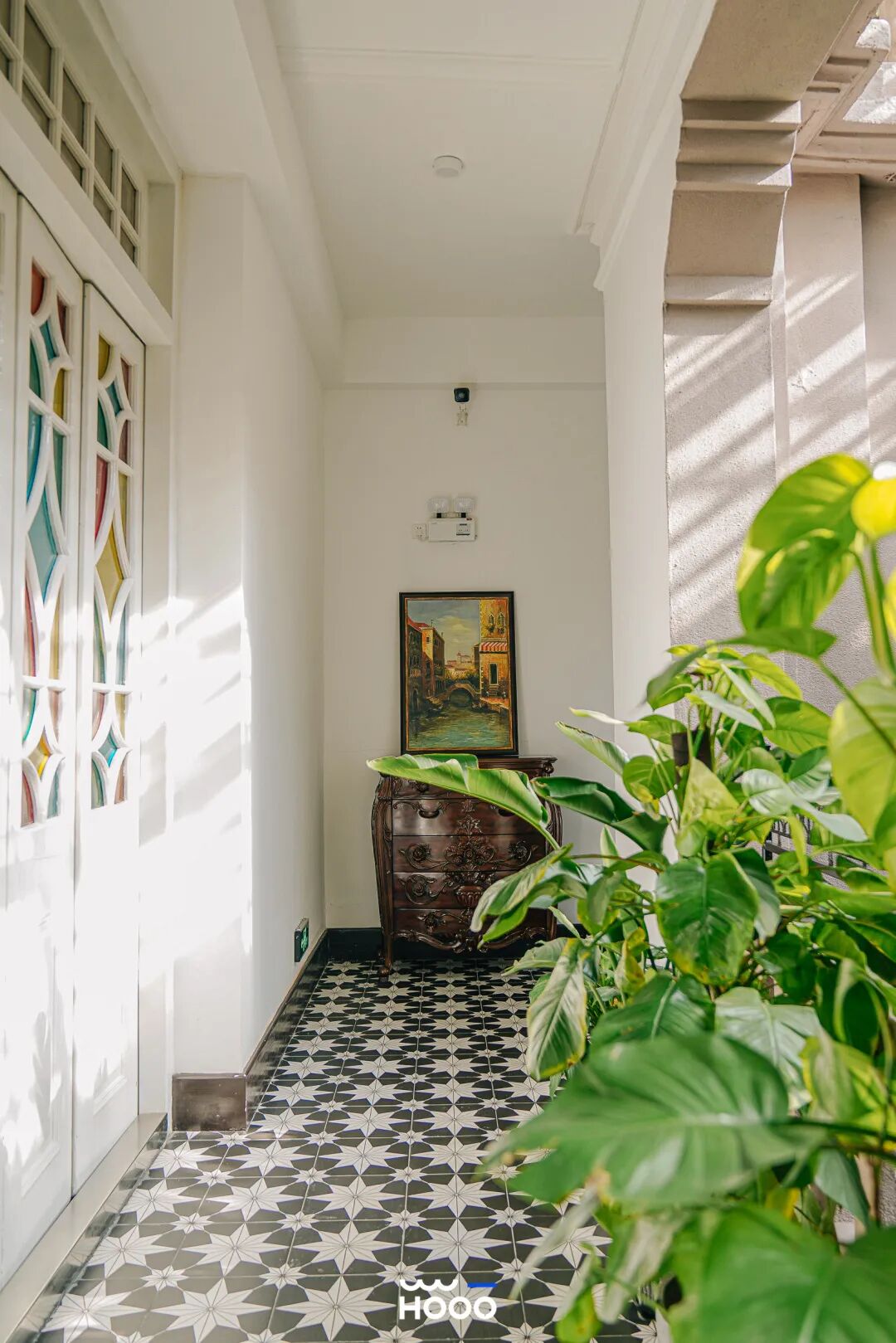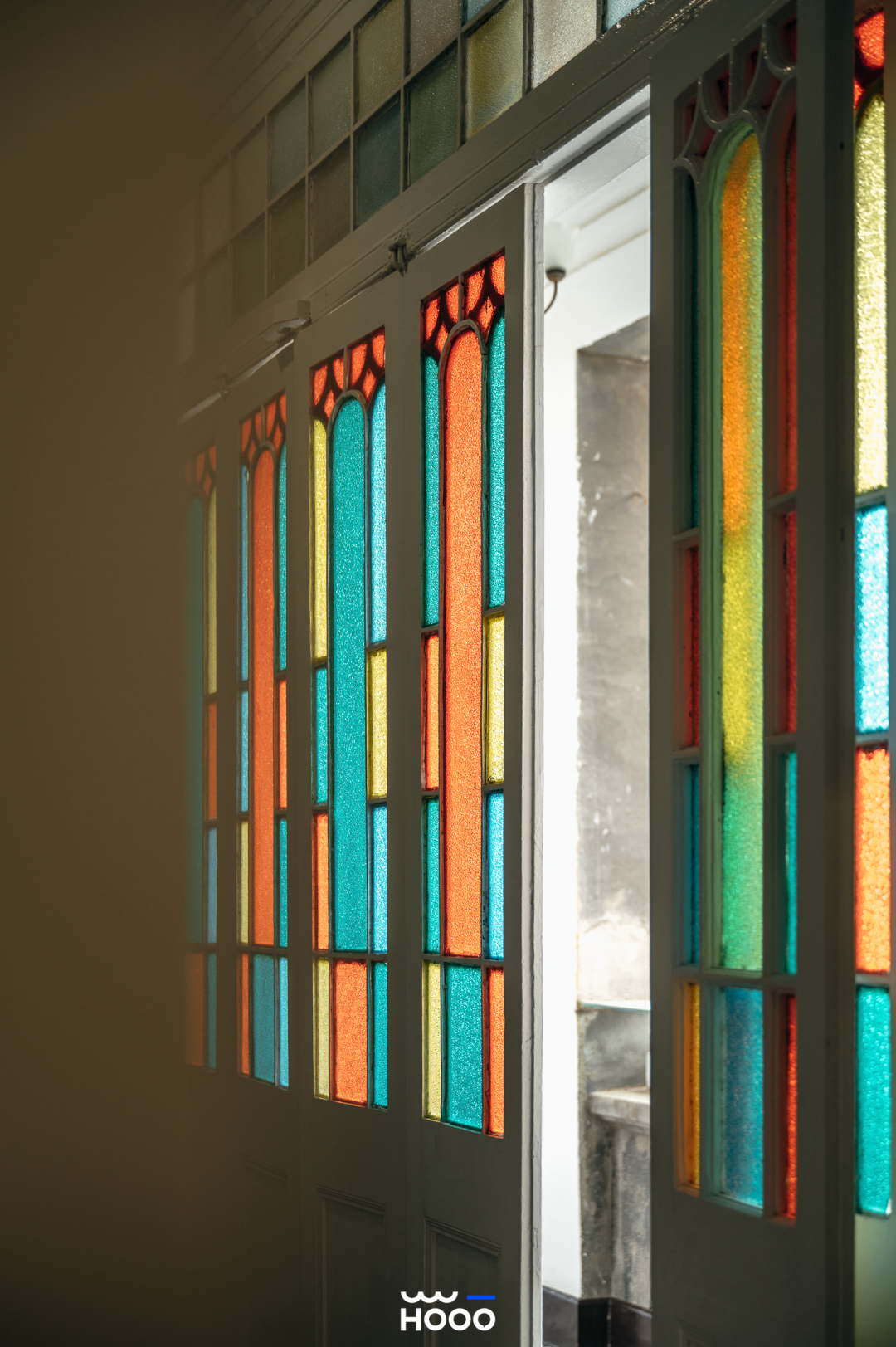 走廊会客区门窗上镶嵌彩色玻璃,花色好看的彩砖贴满地面和墙壁,明媚又鲜艳。