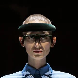 此外,有趣的配饰贯穿在整场秀:只有前半部分的棒球帽,头顶饰有发窟,后半个帽子则整个悬空;粗跟的长靴配格纹和小羊皮;超大蝴蝶结的耳环和像戴紧箍咒一样往前戴的发窟……还是那个顽皮的Tisci先生。